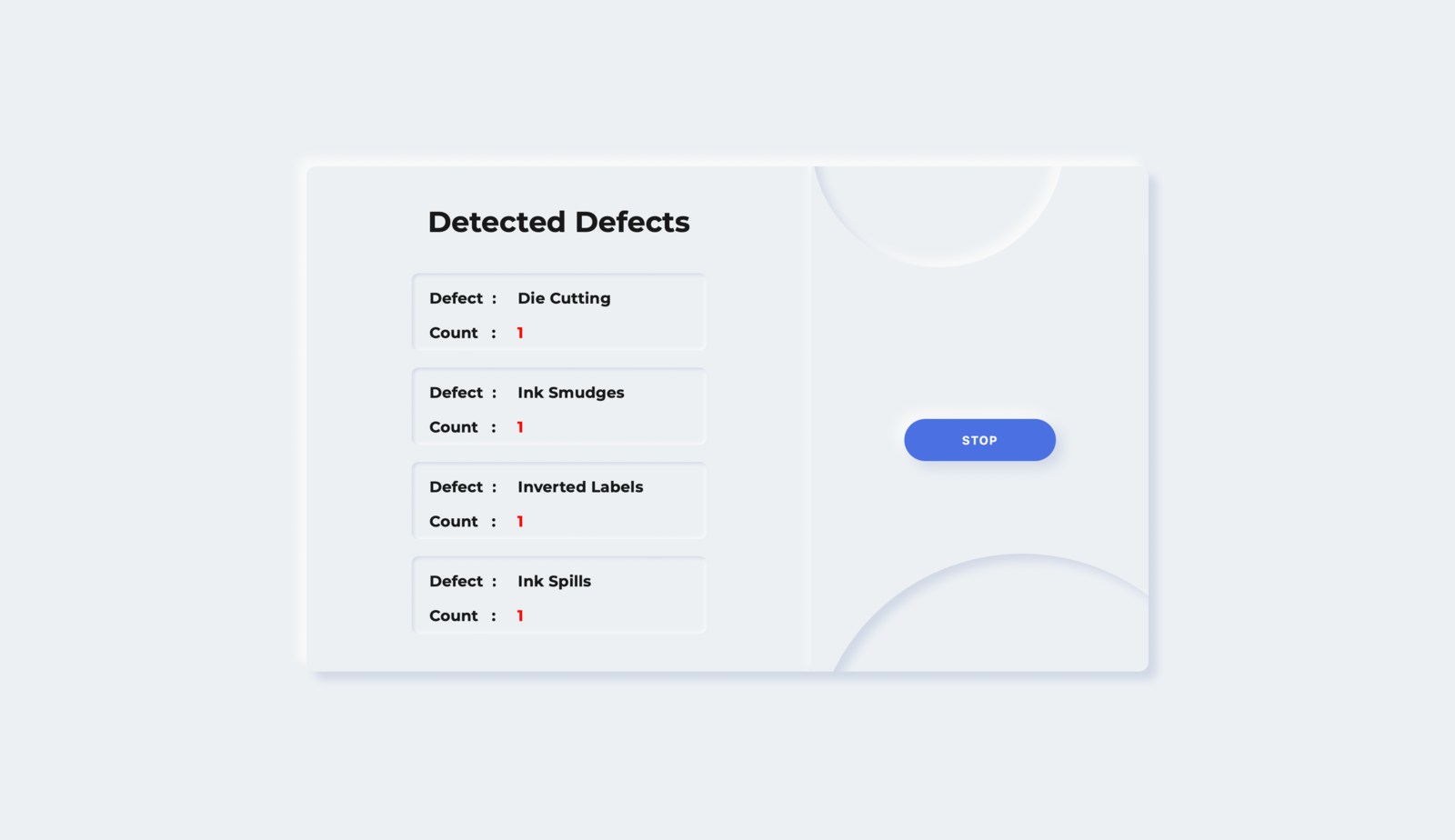 We are using a webpage created using HTML, CSS, and JS to display the defects in real time. The data updated in Firebase Realtime Database is updated on the webpage in real-time. The webpage displays various defects with their occurrences so that the operator can easily look for the particular issue.