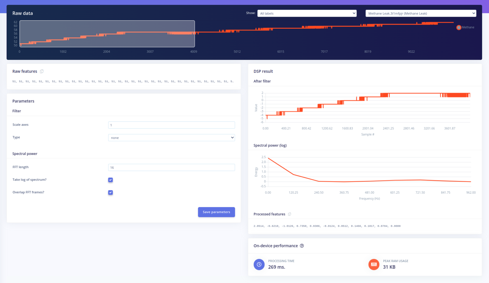 With the training data collected, you are ready to begin designating your methane detection algorithm. In Edge Impulse, algorithms are designed using a drag-and-drop interface called the “Impulse designer”.