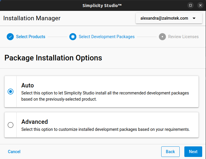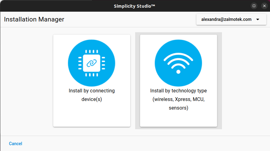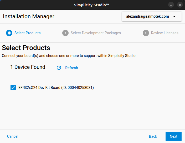 The EFR32xG24 Dev Kit has an on-board USB J-Link Debugger so you’ll need to install the J-Link Software and Documentation pack as well as the Simplicity Studio IDE to be able to program it. Connect the board to your computer using the micro-USB cable and run the Simplicity Studio installer. In the Installation Manager, choose Install by connecting device(s).