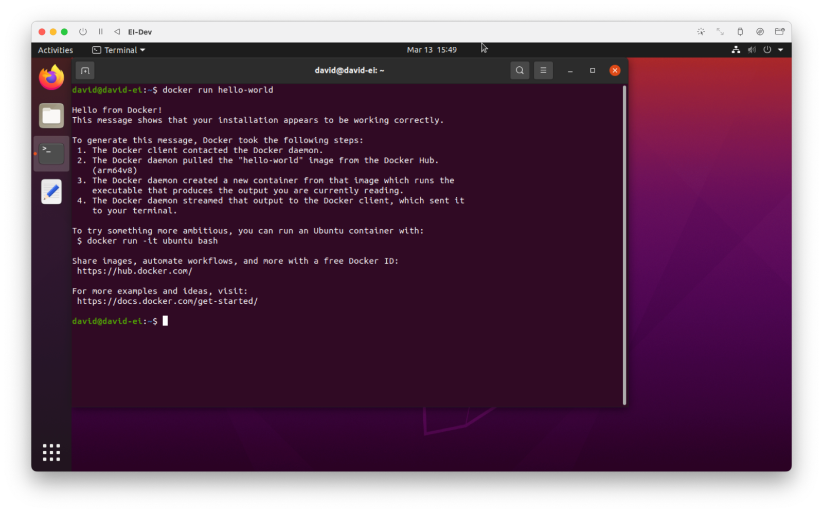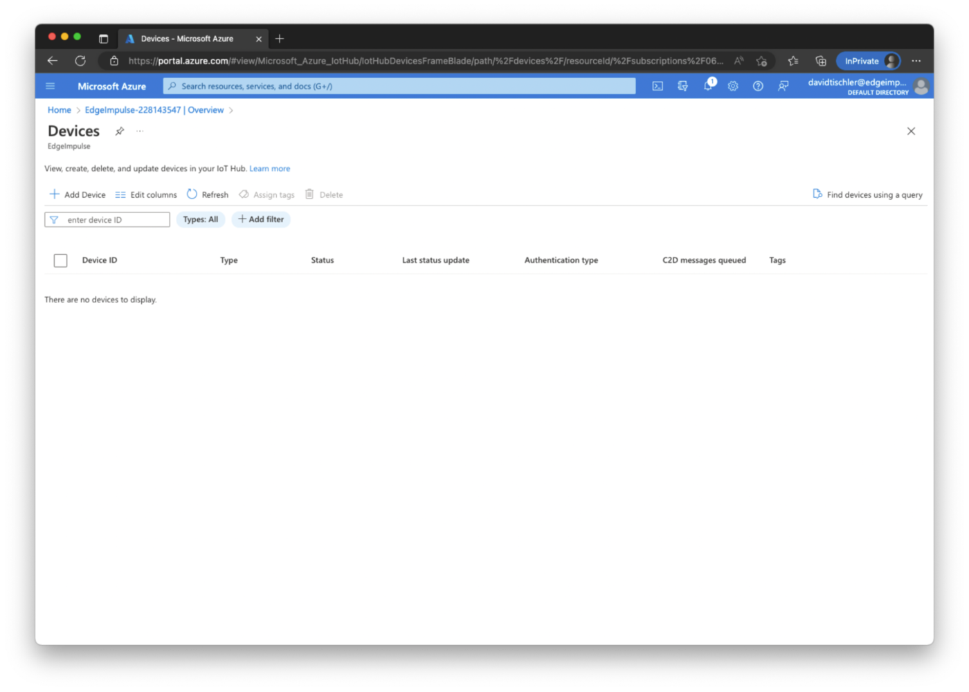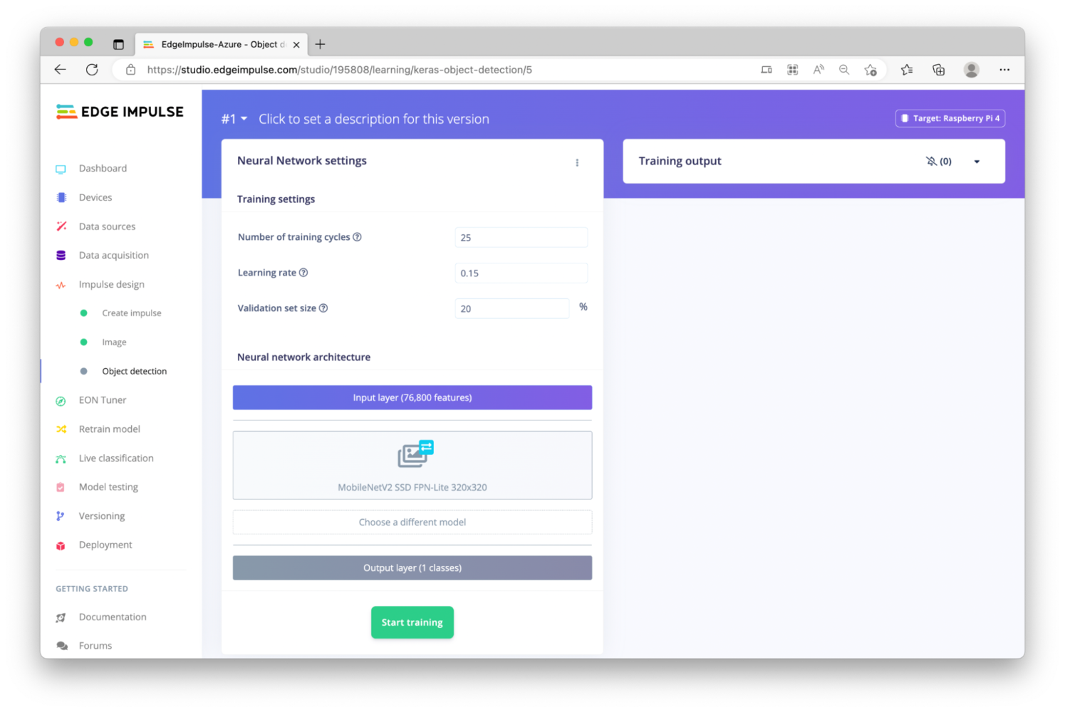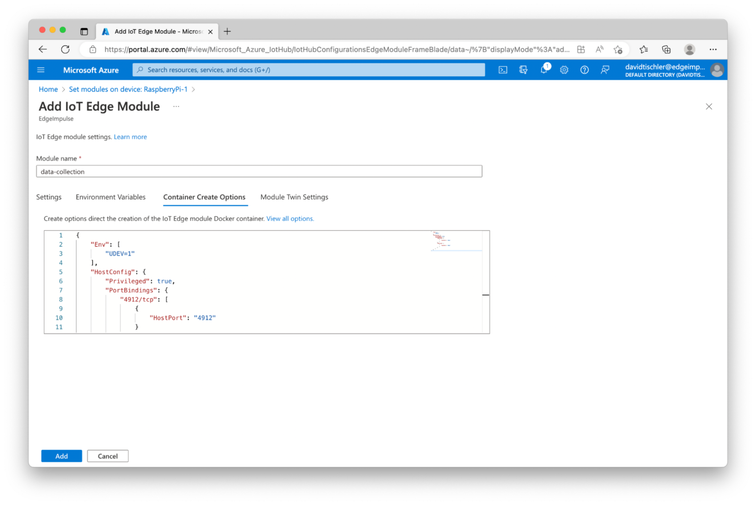 The first step in our MLOps loop is going to be data collection and building a high quality dataset to train our model with. Now that Edge Impulse, Azure IoT Edge, and the hardware are setup, we can begin the process and enter this feedback loop. The Edge Impulse project that we created earlier is still empty, but is ready to accept data. There are lots of ways to connect devices to Edge Impulse, and many ways to capture data. Some of the very easiest methods involve connecting supported devices directly to your computer via USB, and capturing data directly inside the Studio. Smartphones are another great way to easily upload pictures for image classification and object detection computer vision projects. You can refer to the Edge Impulse documentation for more information. In this tutorial we’ll take a less direct approach, but with the benefit of bulk deployment at scale and pushing new models over-the-air later, thanks to Azure. On your development machine, you will need to install Docker. The official documentation is located at https://docs.docker.com/engine/install/, so follow their guidance to reach a point that Docker is up and running on your machine. You should be able to do adocker run hello-world