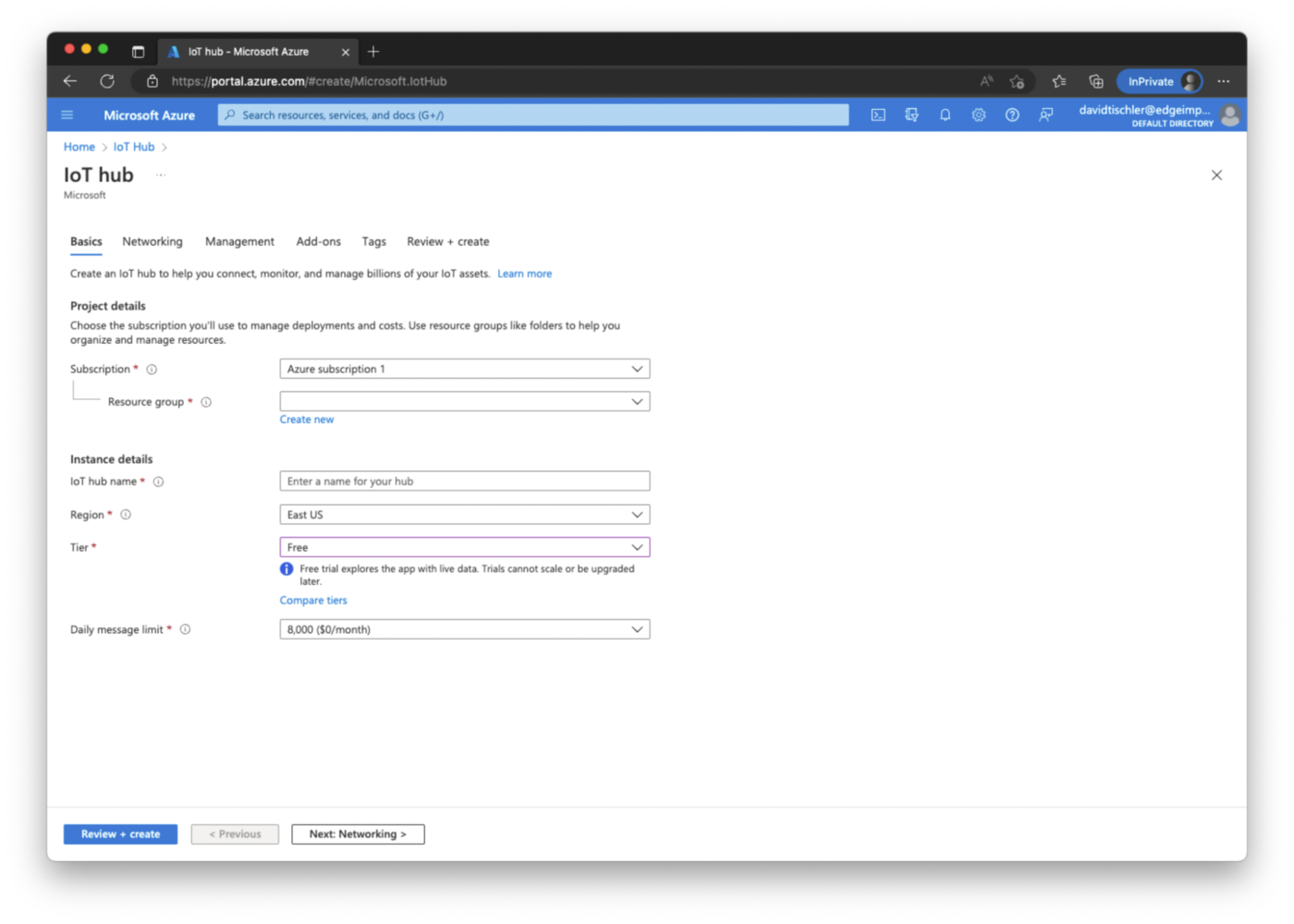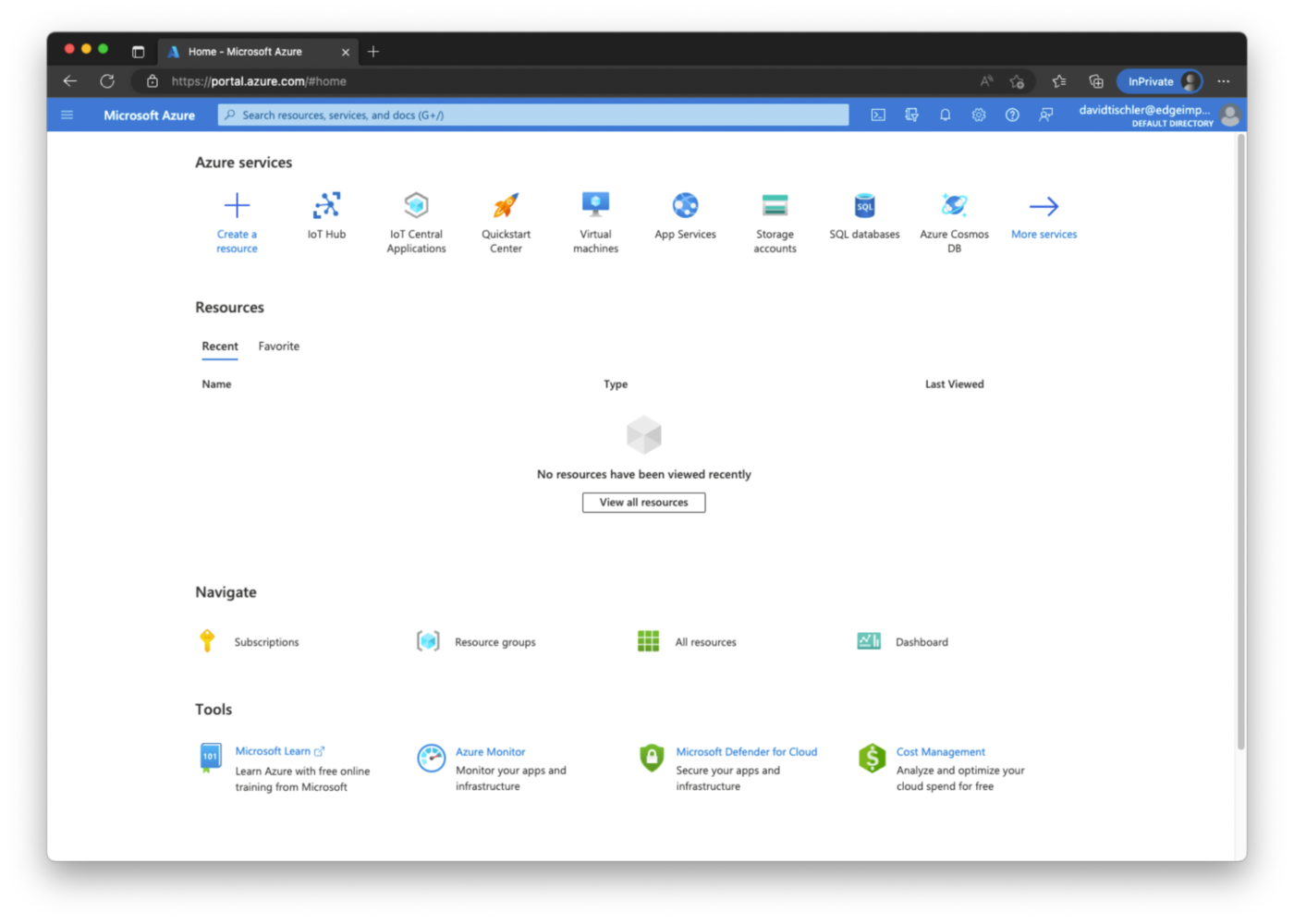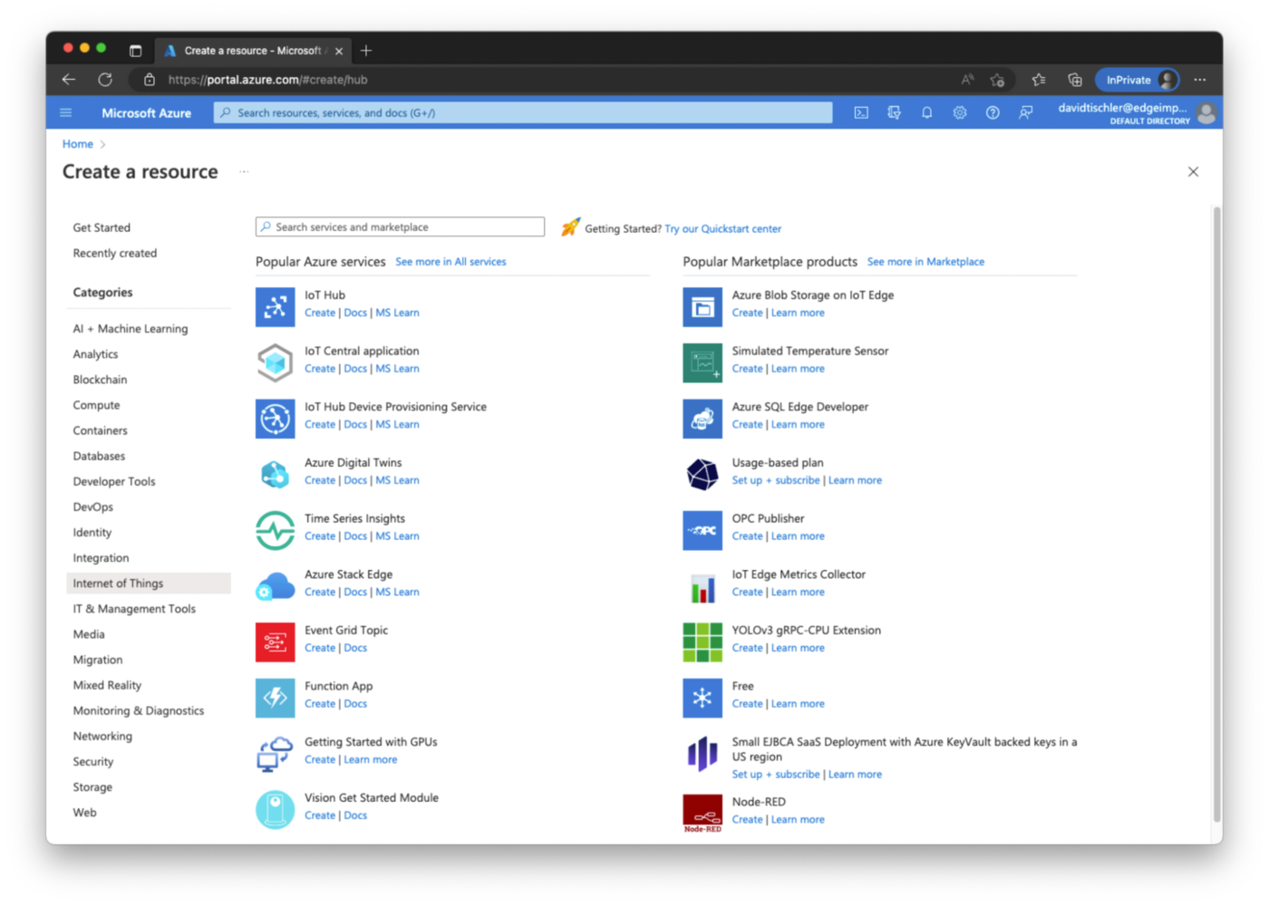 Next we will connect the Raspberry Pi to Azure IoT Edge, so that we can remotely deploy software to the Pi, no matter where it is located. The Azure IoT platform has many more capabilities and features as well, such as remote monitoring, digital twins, integrations with other Azure services, and more. You can read about the rest of the platform on their website, at https://azure.microsoft.com/en-us/products/iot-edge. For deploying applications to a device, the Azure IoT Edge tooling installs a Docker-compatible container runtime on the target device (the Raspberry Pi in this case), and then orchestration and decisions about what containers are sent to the device are performed either via the Azure CLI, VSCode, or directly from the Azure Portal GUI. Setup begins by heading to https://portal.azure.com/, and creating an Azure account if you don’t already have one, or logging in to an existing account. You can follow Azure’s official documentation for any setup steps or other account requirements. Once logged in, you will arrive at the main portal.