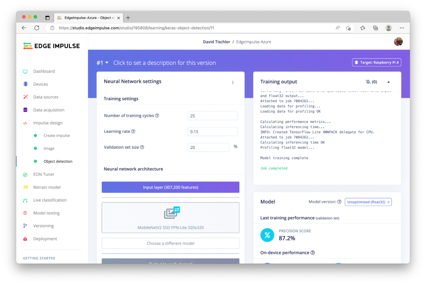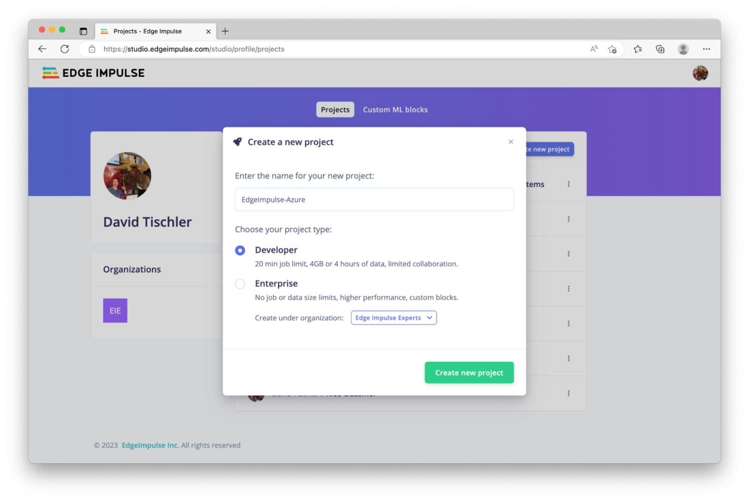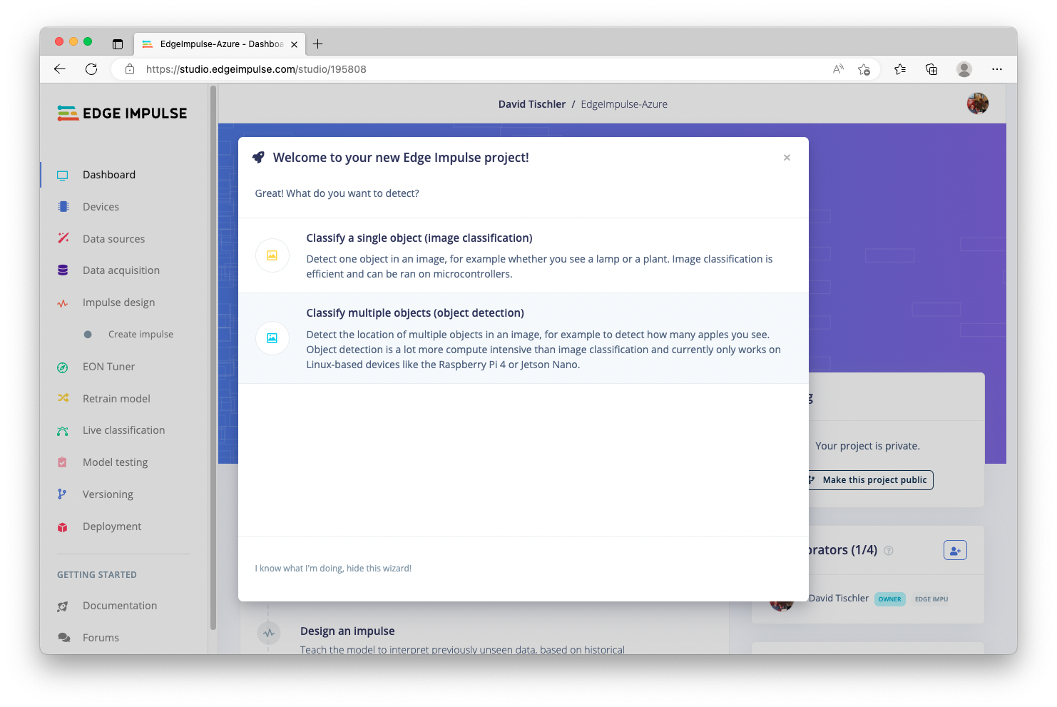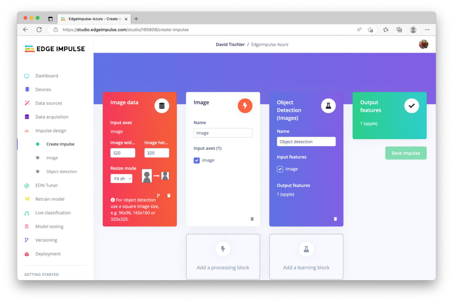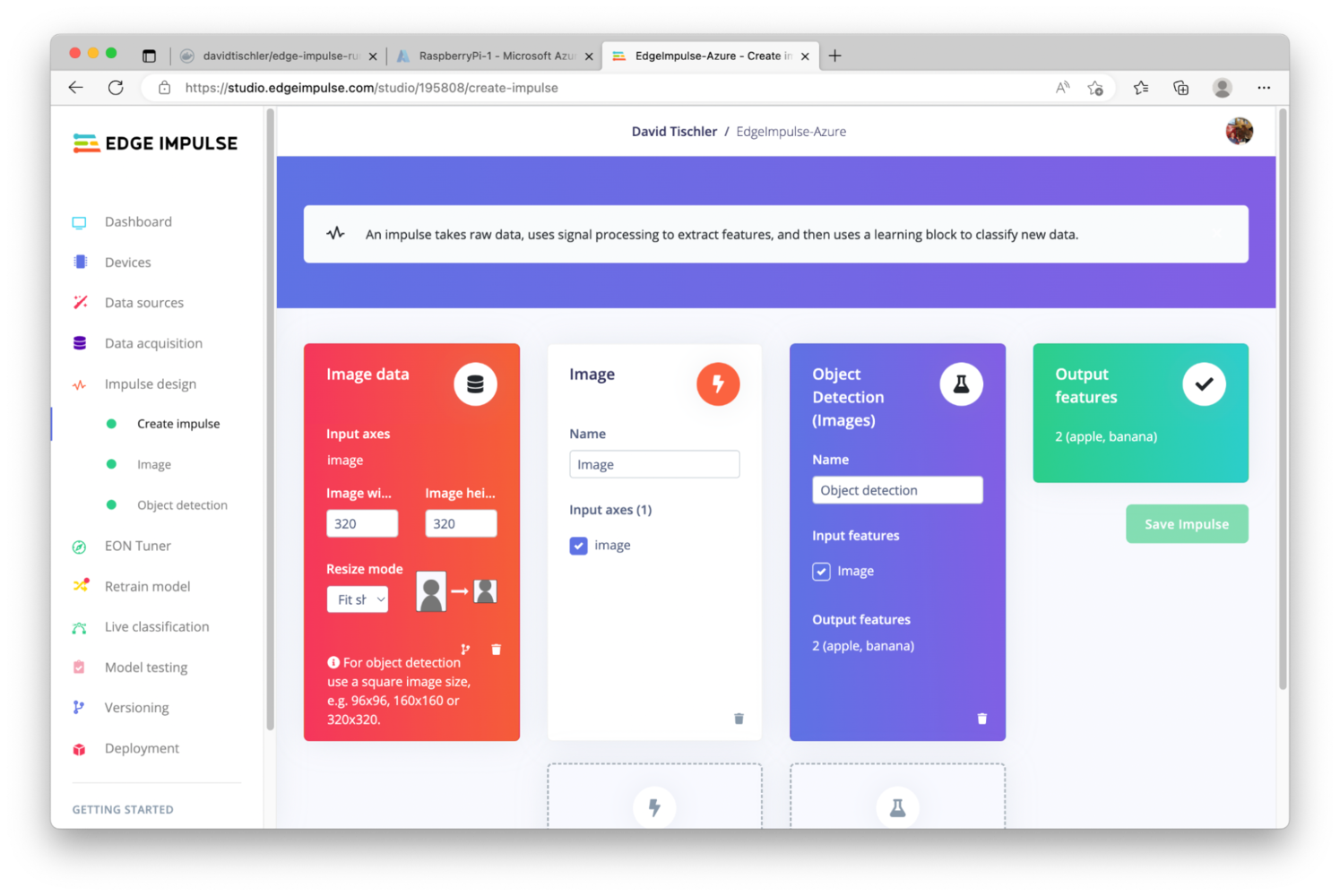 Artificial intelligence (AI) and machine learning (ML) used to require complex software, highly-specialized and expensive GPU servers, and lots of development time. But platforms like Edge Impulse have brought down the barrier significantly, democratizing machine learning for any developer to make use of sensor data, build anomaly detection applications, or perform computer vision tasks like image classification or object detection. This project will make use of object detection, which is easy to accomplish in the Edge Impulse Studio. Specifically, we will use Edge Impulse to collect a dataset of images and train a machine learning model to identify an apple. Then, we will augment our dataset with images of a banana, teach the neural network how to identify the banana, and then push this new updated model to the device with Azure. First, we’ll need to create an Edge Impulse account, or login if you already have an account. Click “Login” at the top right of the page, on http://edgeimpulse.com.