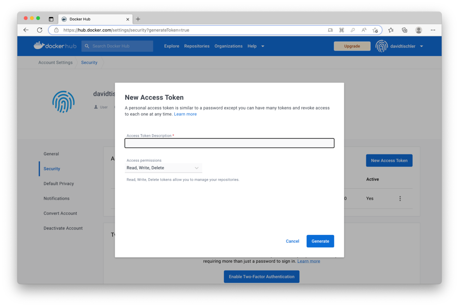 Depending on your experience with Docker, or as you may have seen while reading their documentation, containers get built and placed into container registries. You can host a container registry yourself, and store all of your containers on a private server, or even your own local desktop or laptop. However, many developers choose to use existing container registries like Docker Hub, or the Azure Container Registry. We’ll choose Docker Hub here, as it’s a popular platform that’s easy to use. If you don’t already have an account at https://hub.docker.com/, create one (again, a Free account works perfectly fine for this tutorial), log in, and click on your username at the top-right to view the drop-down menu. Click on Account Settings, then click on Security on the left, and then click the “New Access Token” button. This will be used to login to Docker Hub from the command line on your development machine.