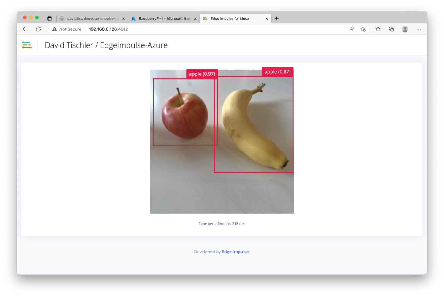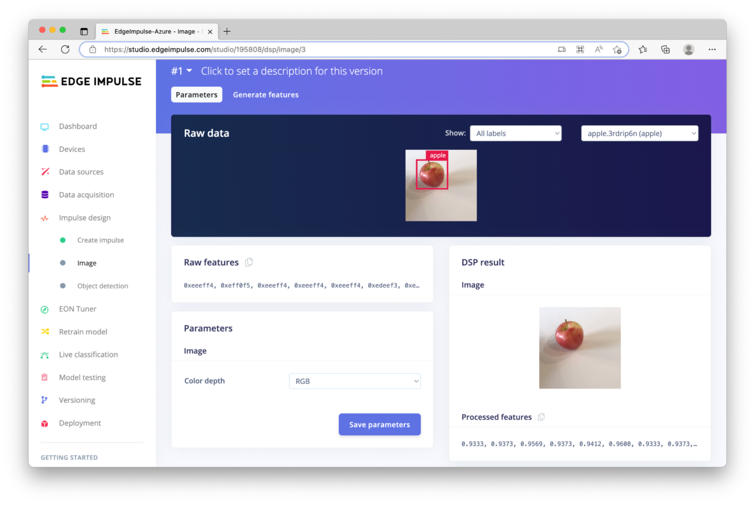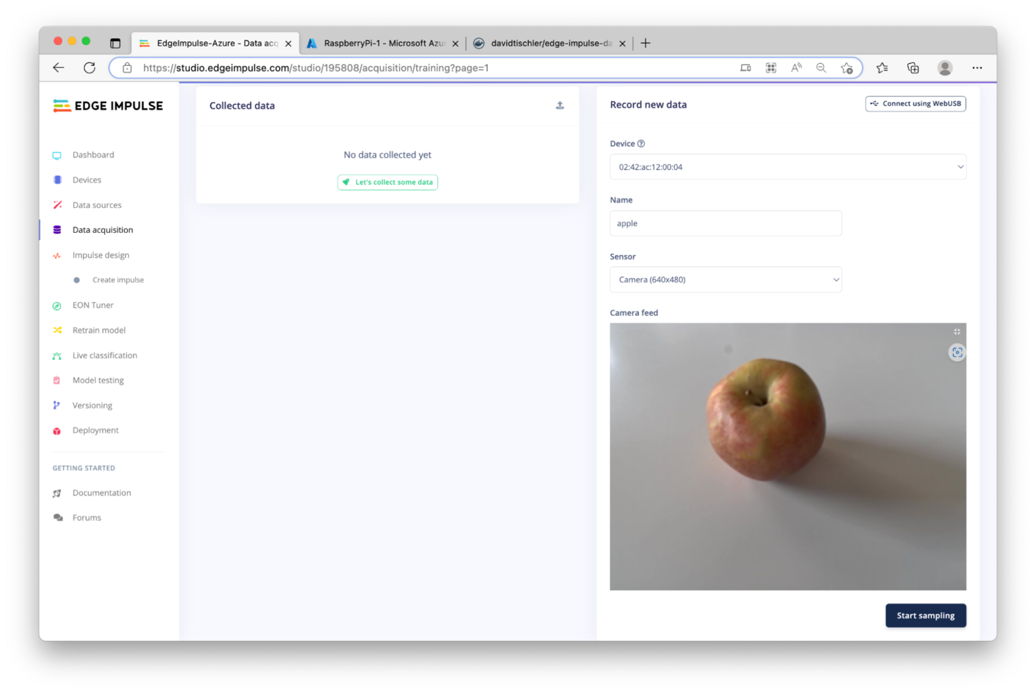 . With our Dockerfile and the startup script, this container will connect to the Edge Impulse Studio as a camera device, so that we can begin taking pictures of apples, or for more enterprise deployments, collect data from the field. The goal at this point is still go collect data and build a high-quality dataset, and this container will start us on that path. We’re now ready to build the container, and then place it somewhere that Azure can reach it.