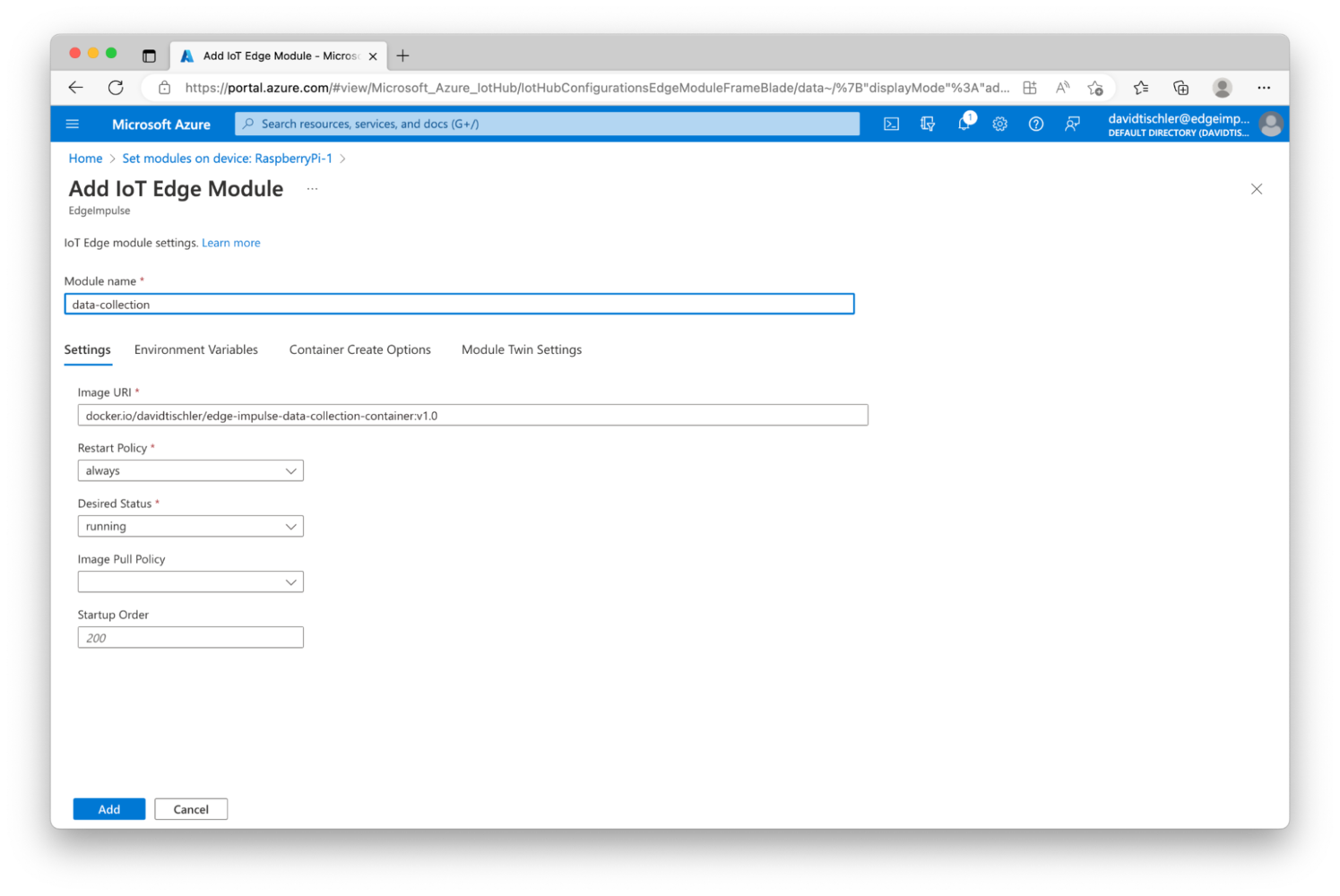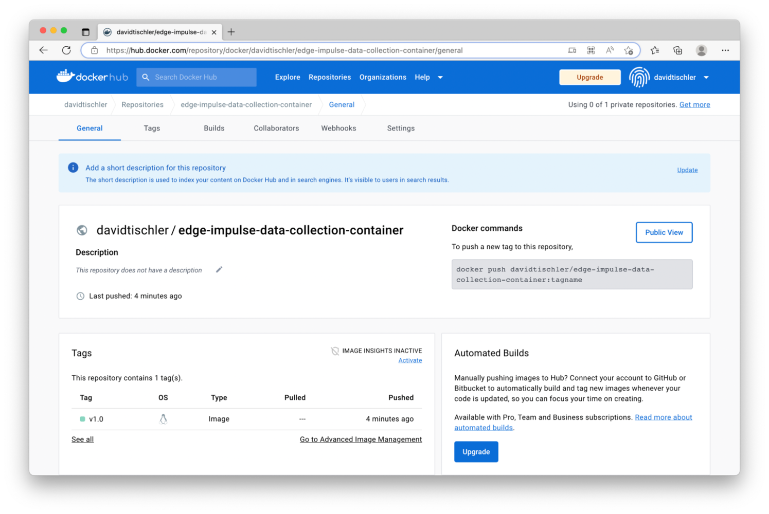 . Thus, you will use docker.io/YourUsernameThatYouCreated/edge-impulse-data-collection-container:v1.0
