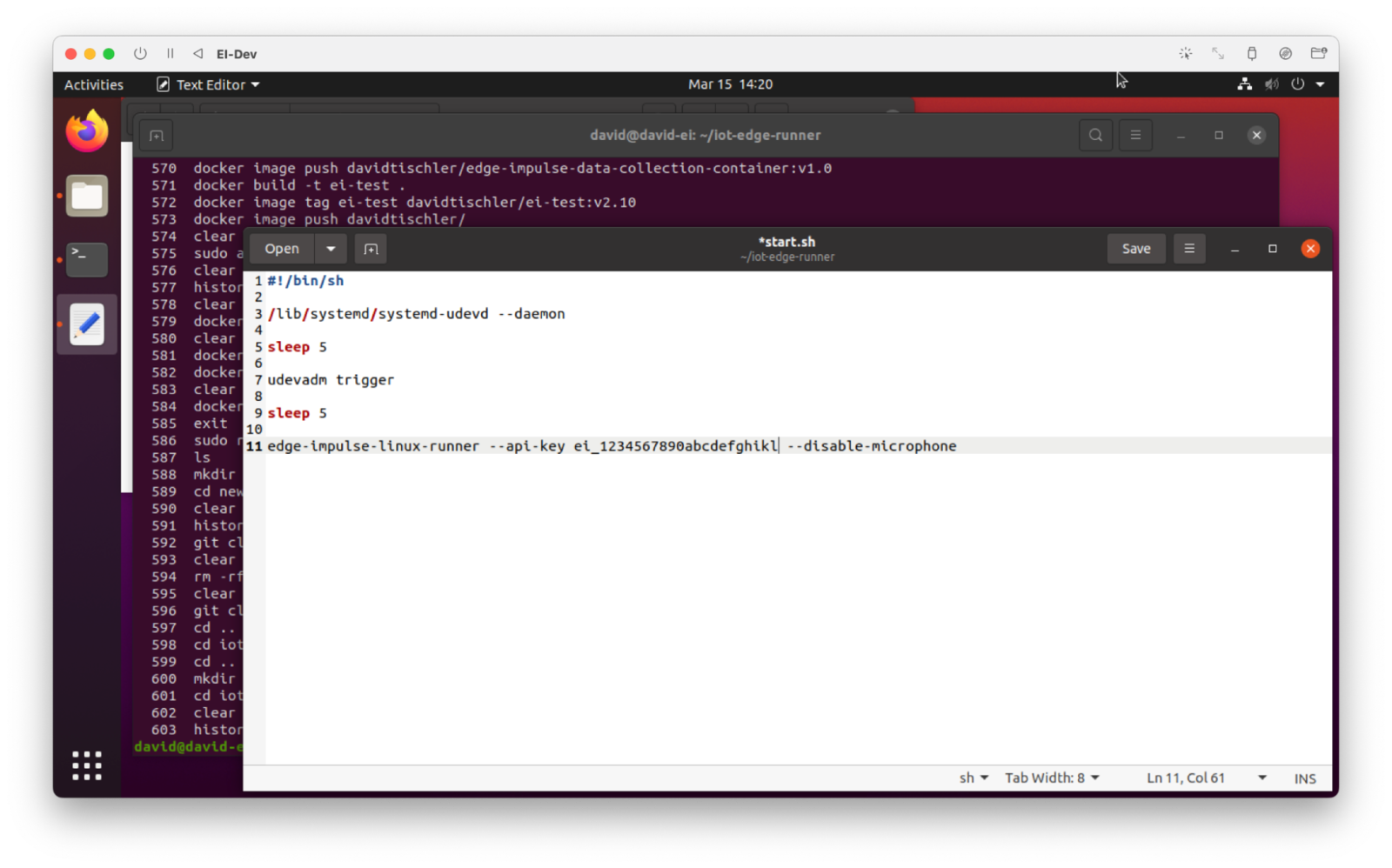 file, and are going to place it into the Docker Hub in a Public repository. This is not secure, nor a best practice. However, if you use a Private repository, that would be fine. Or, even better, is to use a variable here and then provide that variable as an input to the Docker container creation, over in Azure. That methodology has the added advantage of quickly being able to switch among Edge Impulse projects simply by altering the variable. However, for demonstration purposes, we’ll leave this key in the start.sh