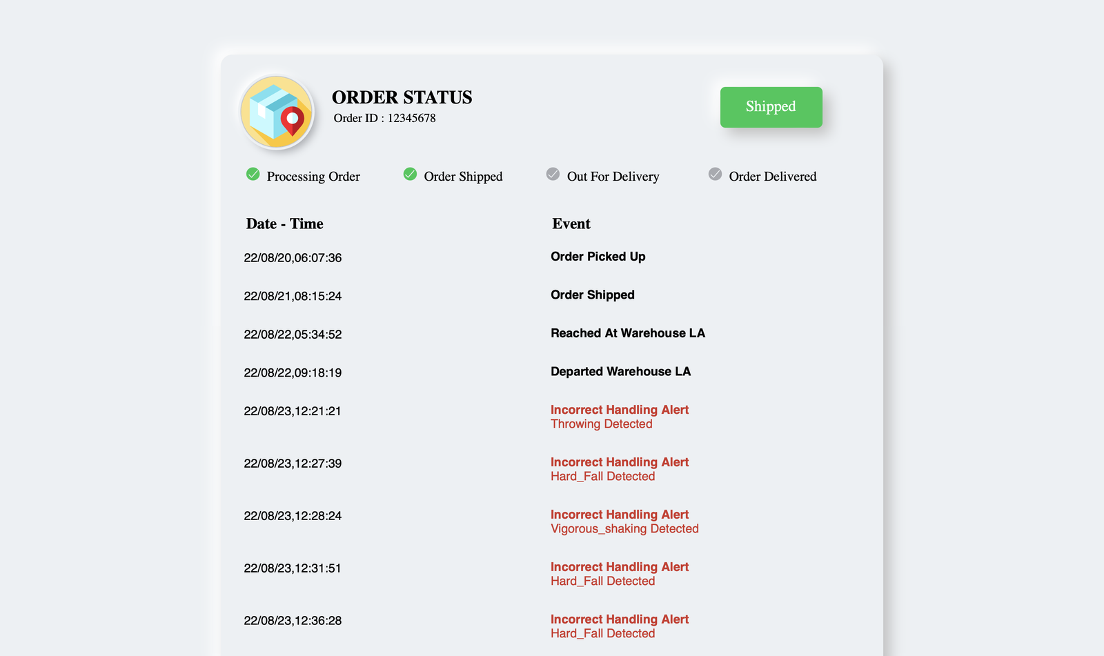 The web interface is designed in such a way that it can reflect all the events updated in the Firebase database. The insecure handling events are updated in the Firebase directly from the Nano 33 BLE Sense and other shipping updates can be updated using an API.