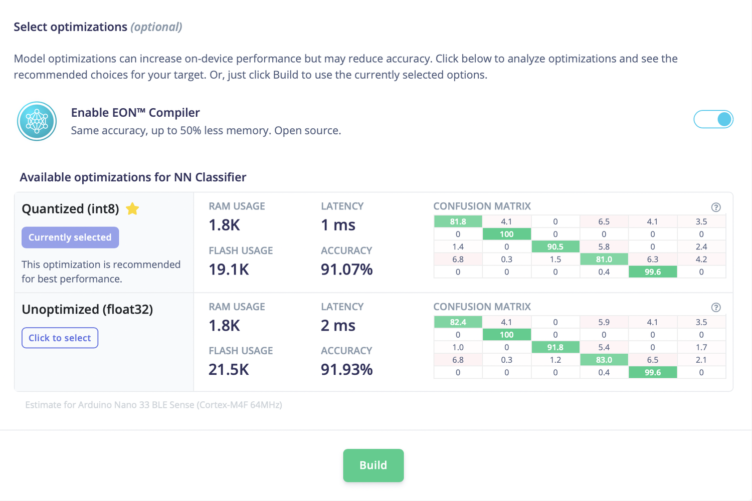 Once the model is trained and tested, it’s time to deploy it back to the device. For this, navigate to Deployment > Build Firmware. Select Arduino Nano 33 BLE Sense and Build. It will generate the model and download it to your computer as a Zip file. Add the downloaded Zip file in the Arduino libraries, and you are good to go.