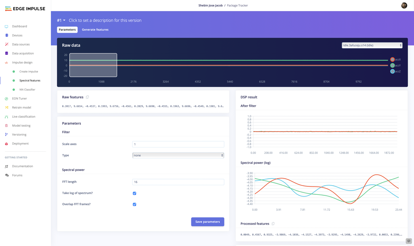 By creating an Impulse in Edge Impulse, you’re creating your own machine learning pipeline. Navigate to Impulse design > Create Impulse An impulse contain 3 blocks : input block, processing block and a learning block. I have chosen Time series data as my input block, Spectral Analysis as the processing block, and Classification (Keras) as the learning block. You can add an anomaly block if you’re interested in detecting anomalous motions, I’m just omitting it for now.