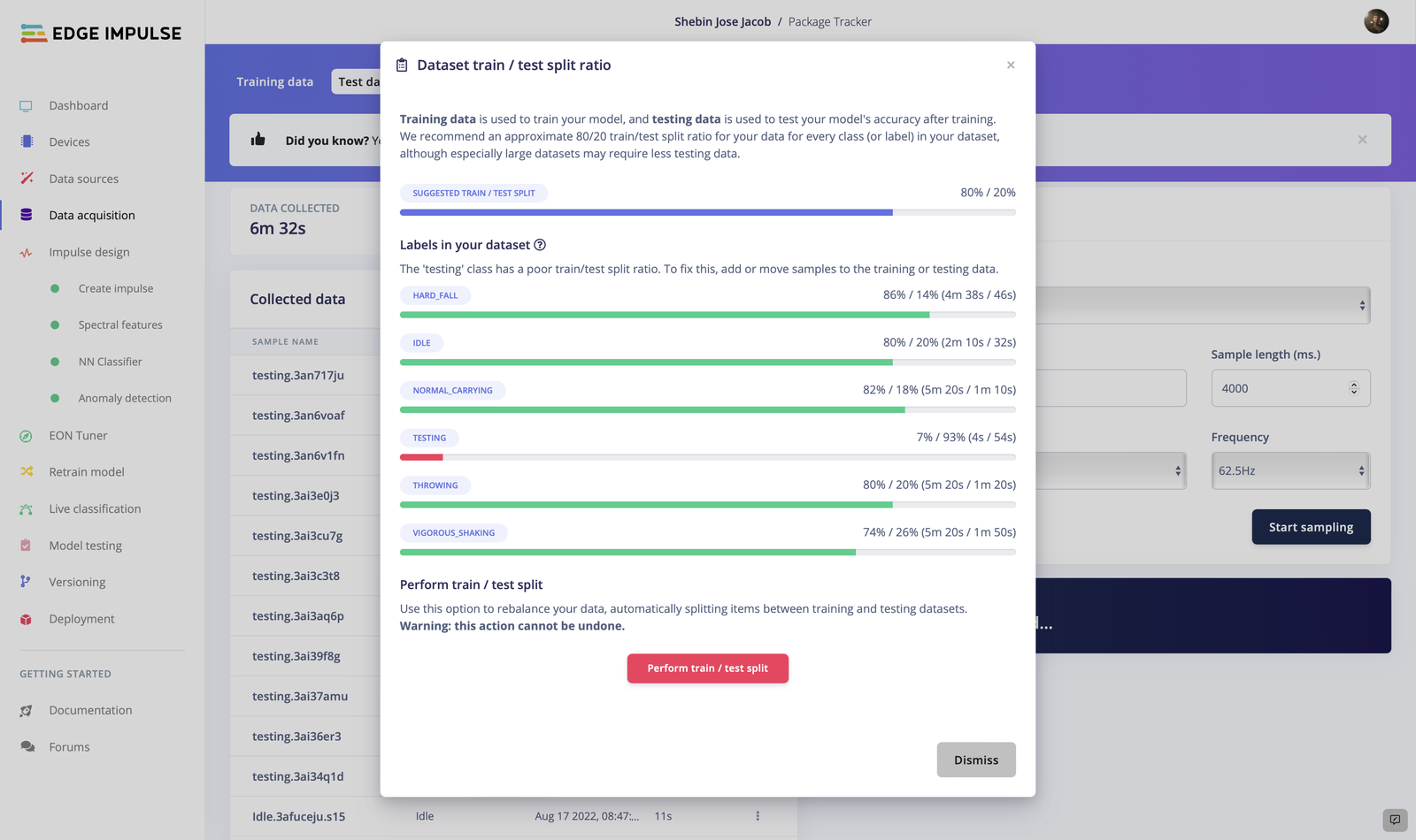 Once we have a clean dataset, split it into training and testing datasets. Here we split them up into two groups, in the ratio 80:20. If your data is not split, perform a test/train split either from Data Acquisition Tab or from Dashboard