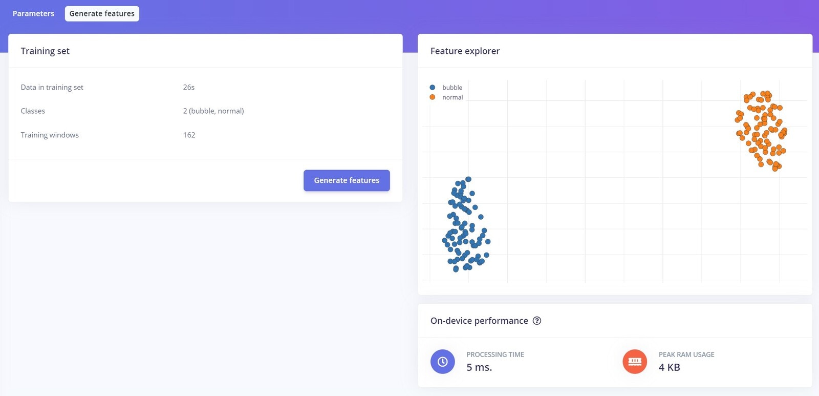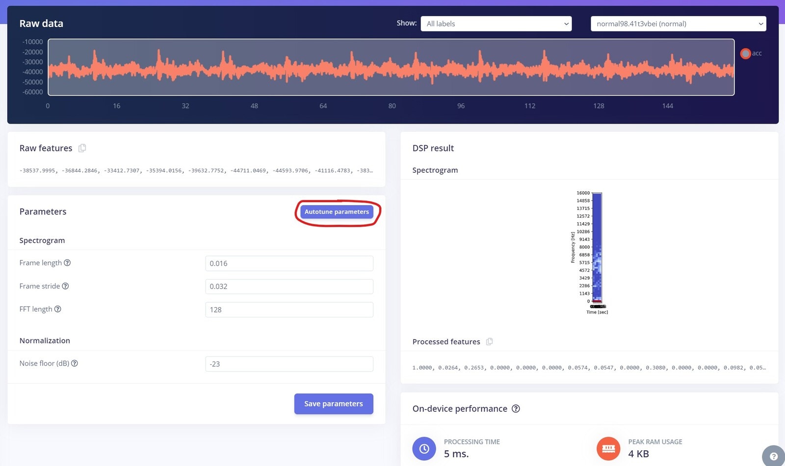 The Spectrogram processing block extracts time and frequency features from a signal. It performs well on audio data for non-voice recognition use cases or any sensor data with continuous frequencies. Low-pass and high-pass filters can be used in this block to eliminate undesirable frequencies. As with our use case, this block typically performs well when decoding recurrent patterns in a signal, such as those caused by the vibrations or motions picked up by an accelerometer unit. Under the Parameters tab, you can configure your spectrogram features or let the Studio do it by clicking on the “Autotune Parameters” button.