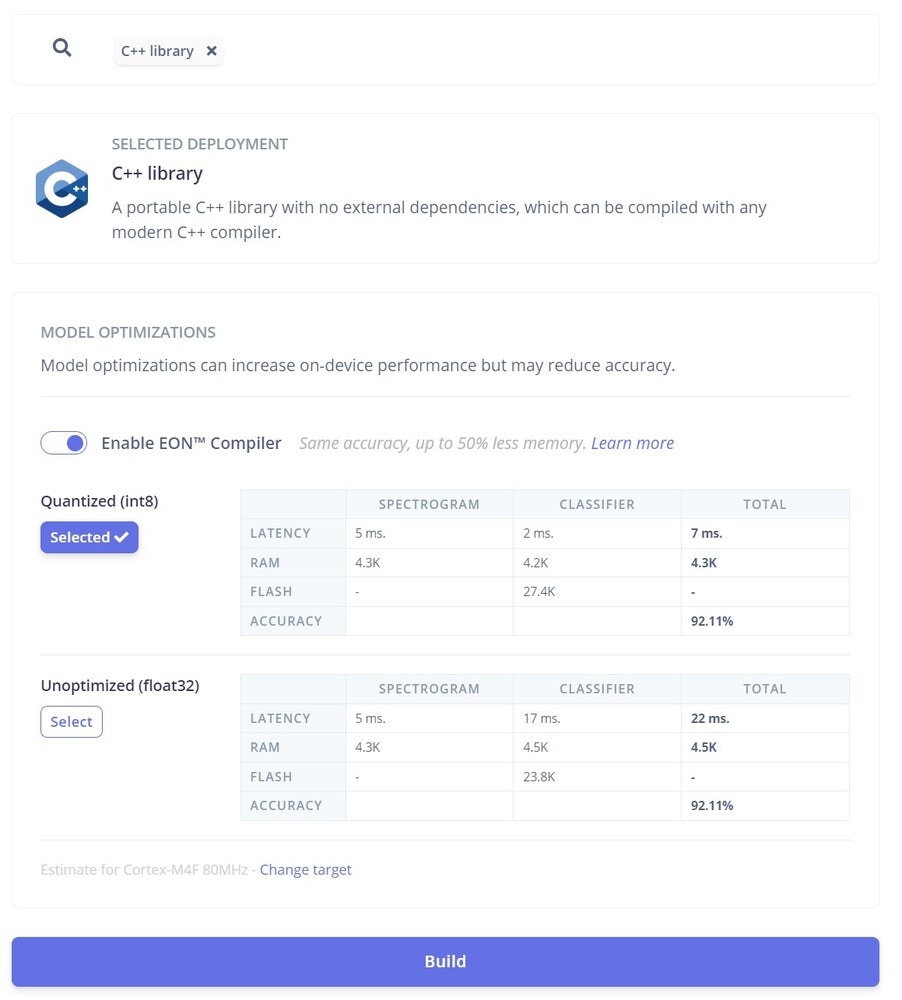 Edge Impulse allows users to export the machine learning model they have just created as a pre-compiled binary for the supported platforms without going through the effort of building custom firmware. However, since our platform uses different sensors supported by the original board, we must download the model as a C++ library and then integrate the SDK into our firmware.