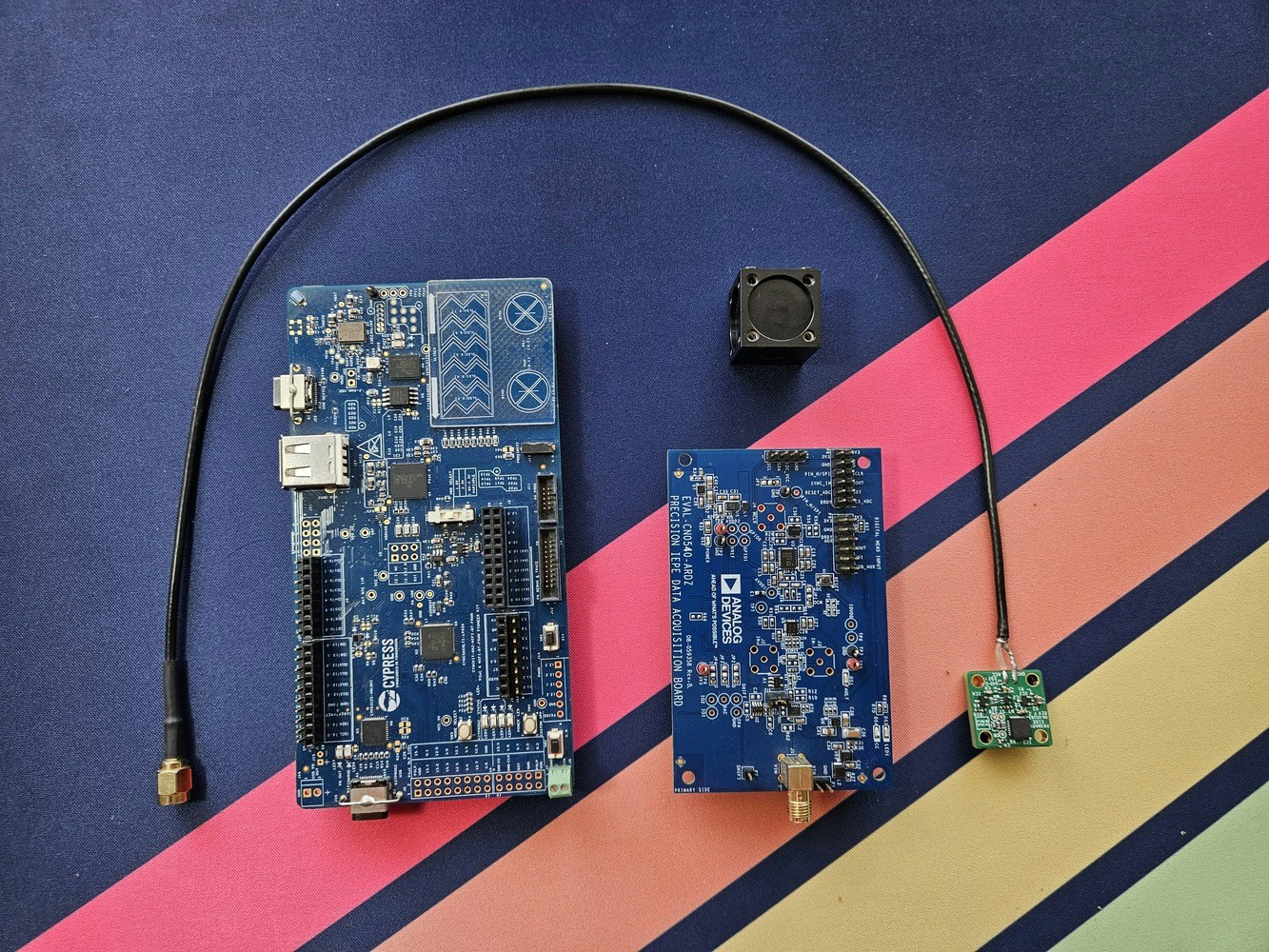 For this application, we will use a condition-based prototyping platform developed by Analog Devices (CN0549) and PSOC 6 Wifi-BT Pioneer Kit by Infineon. The CN0549 is a condition-based monitoring platform based around the integrated electronic piezoelectric (IEPE) standard, a popular signaling interface standard for high-end microelectronic mechanical systems (MEMS) and piezo sensors that are prevalent in industry today. The kit comes with a mechanical mount optimized for vibration fidelity. For setting up the board with the sensor and to learn more about the hardware, please refer to the links below: The anchor of this solution is Infineon’s PSOC 6 Wifi-BT Pioneer Kit. The application processor is performance-optimized and runs at 150 MHz, and the co-processor is an Arm M0 core, which can run at 100 MHz. Both cores are power-efficient. It has a floating-point unit (FPU), an 8 KB 2-way associative cache, 1 MB Flash, and 288 KB RAM. The board also has a capacitive sensing block and the capability of programmable digital and analog blocks known as PSOC. It is an excellent pick for developing edge ML applications requiring a direct sensor interface. Moreover, board Wi-Fi support and a USB host device can be helpful for high-speed data logging. Here are some pictures of the hardware before and after the assembly. Refer to the CN0549 reference guide for sensor-specific modifications, such as selecting coaxial wire and jumper settings. Switch theSW7 to position one on the MCU board side, ensuring that the sensor board is powered from kitprog2 stable VDD supply. Also, ensure the board is in daplink mode for easy debugging in the software section.
