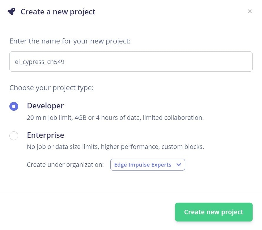 Let’s start by developing an Edge Impulse project. Log into your Edge Impulse account, pick Create new project from the menu, give it a recognizable name, choose Developer as the project type, and then click Create new project.