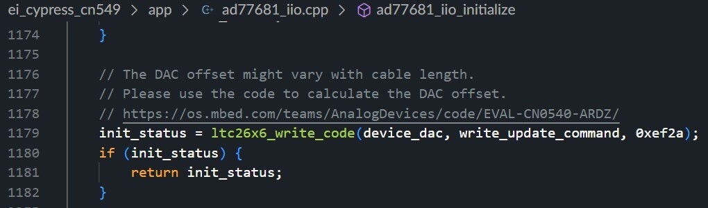 The default firmware available for CN0549 is based on mbed-OS and the iiod stack. Since our CY8CKIT-062-WIFI-BT is also mbed-enabled, we can port the existing code to our board with little modifications. I have already done that for you; you can directly import the firmware into the Keil studio cloud from the link below, which lets you build and debug the firmware inside the browser. Some of the modifications done so far to make this compatible are listed below:- Changed the SPI mode in the