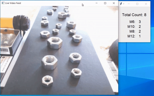 means that 3 nuts were found, 2 M10’s and 1 M8.- The live feed in the program needs a separate camera, the OpenMV camera can’t be used as its serial port is occupied by transmitting inferencing data. Starting from around row 102 in the program, you’ll find the function