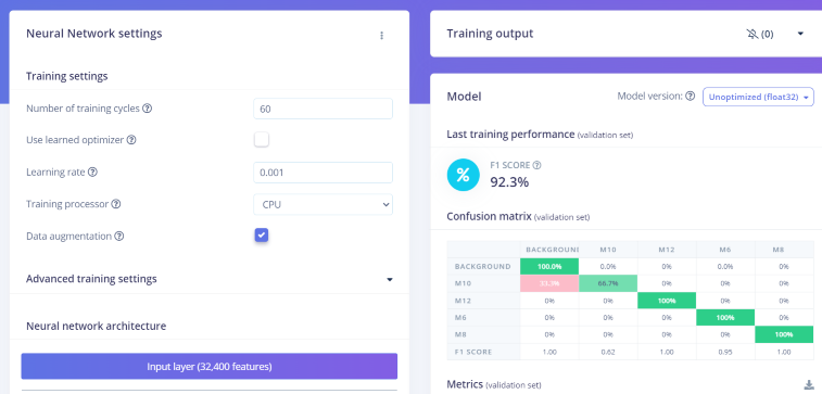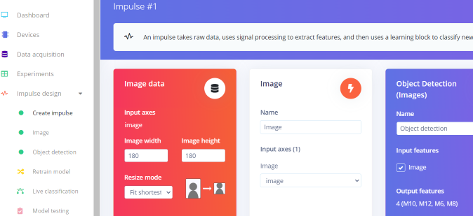 After you’ve uploaded data to Edge Impulse, the next steps are to set up the ML pipeline in the platform. It’s made so easy so I did not need to use a tutorial, but for a newcomer I warmly recommend this tutorial Detect objects with FOMO.- I played around with different image sizes, and found the sweet spot to be 180 x 180 pixels.