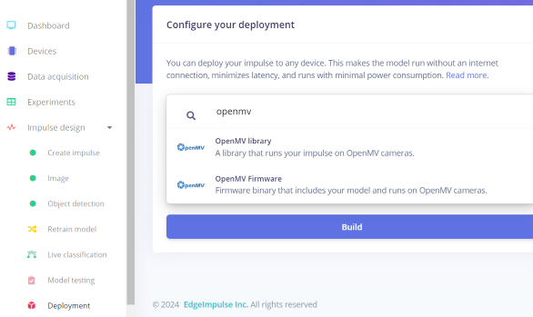Now it’s time to test the model in real life!- Head over to the Deployment tab, and search for ‘OpenMV’.