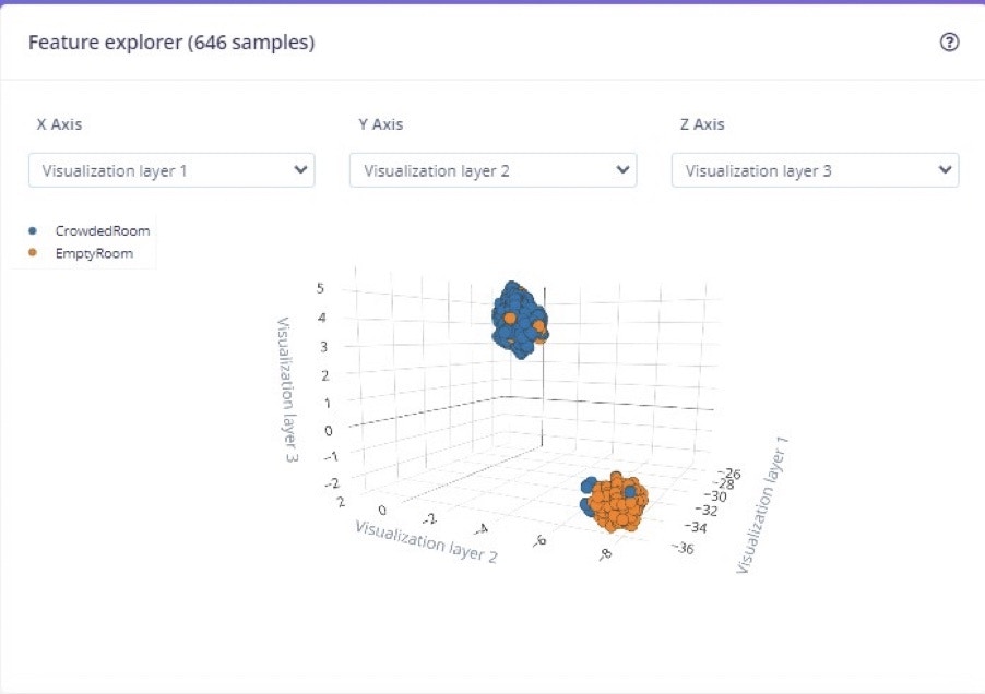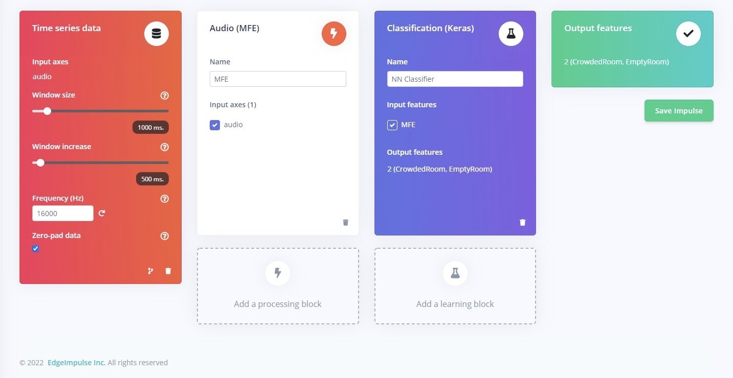 With the data in place, let’s start building our Impulse. You could look at an Impulse like the functional Block of the Edge Impulse ecosystem, and it represents an ensemble of blocks through which data flows. An impulse is made out of 4 levels: The input level, the signal processing level, the Learning level, and the output level. At the Input level of an impulse, you can define the window size, or to put it simply, the size of data you wish to perform signal processing and classification on. Make sure the Frequency matches the recording frequency used in the Data Acquisition phase and that Zero-pad data is checked. The Signal processing level is made out of one or more processing blocks that enable you to extract meaningful features from your data. Due to the fact that the model we are training is supposed to run on the edge, we must identify the most relevant features and use them in the training process. There are many processing blocks available that allow you to extract frequency and power characteristics of a signal, extract spectrograms from audio signals using Mel-filterbank energy features or flatten an axis into a single value and more, depending on your specific use case. If needs be, Edge Impulse also allows its users to create their own custom processing blocks. The Learning level is where the magic happens. This is the point where the model training takes place. Edge impulse provides various predefined learning blocks like Classification (Keras), Anomaly Detection (K-Means), Object Detection (FOMO) and many others. In the Output level, you can see the 2 features your Impulse will return after running the data through the previous levels.