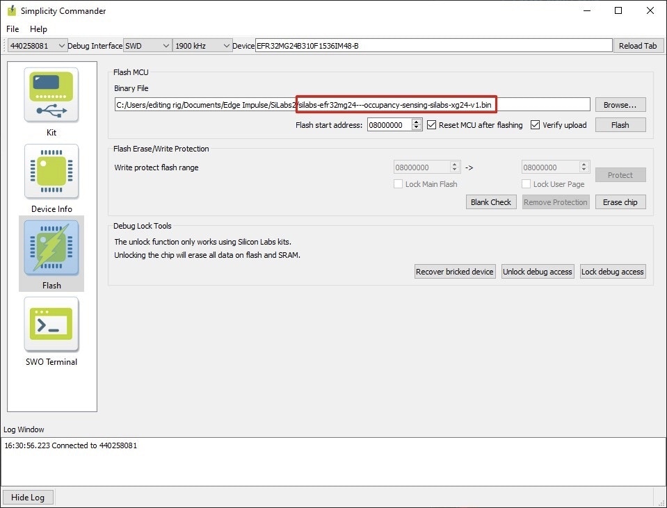 - Use a micro-USB cable to connect the development board to your PC and launch Simplicity Commander. You will be met with a screen containing various information regarding your development board like Chip Type, Flash Size, and more.