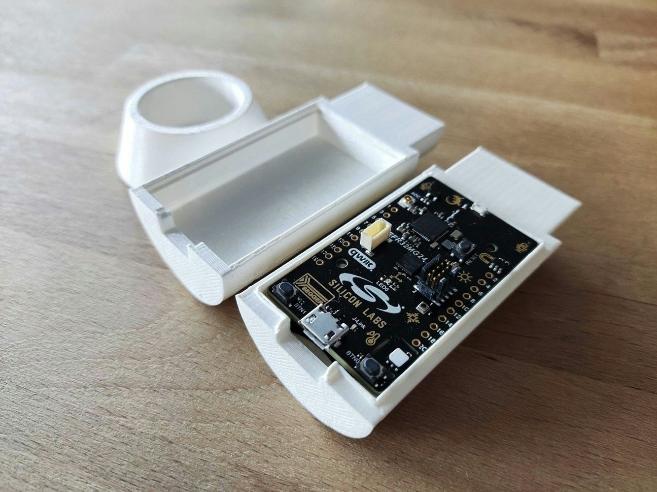 Since all sensors are present on the development board there is not that much to do on the hardware side, you will use the USB cable to program the board, and afterward, to test it you can use a CR2030 battery to supply its power. Mileage will vary based on the use case and how often you read the sensors and you send data to the cloud. Since it will be mounted in a room where you want to detect the presence of persons we decided to create a 3D enclosure so it protects the development board and keeps it nice and tidy. While the whole action takes place indoors, there are still some accidents that happen on a conference table, like liquid spillage, that might damage the board. In this case, the 3D printed case offers an extra level of protection by elevating the board above the table-top level.