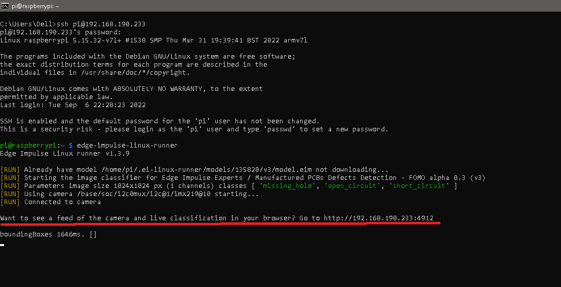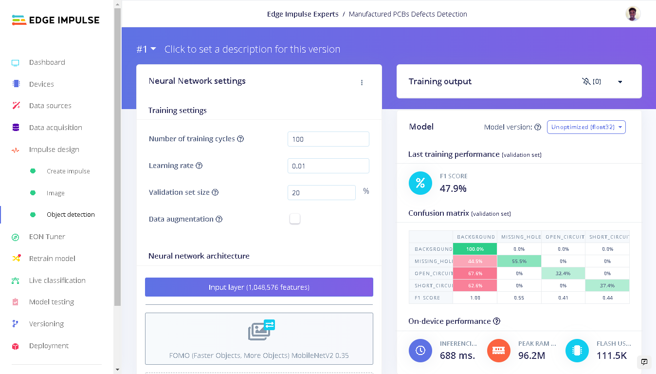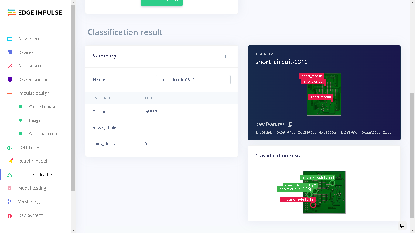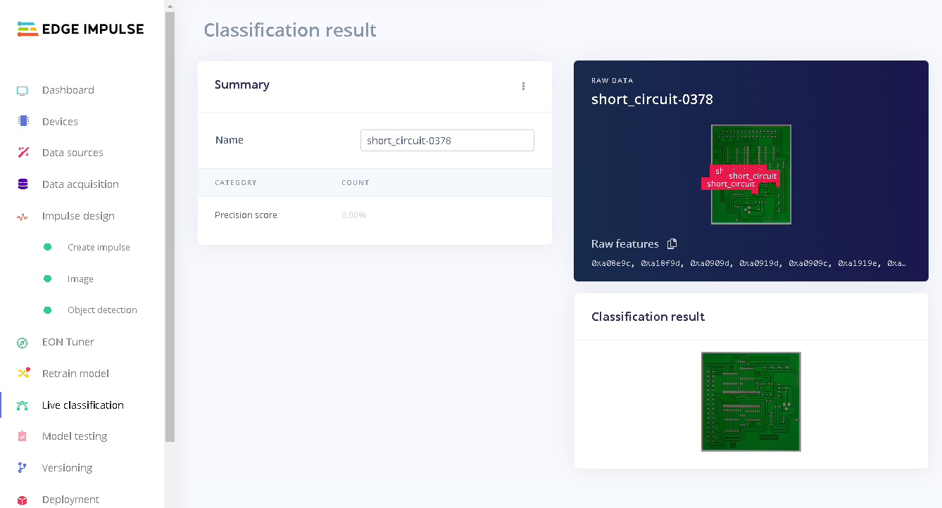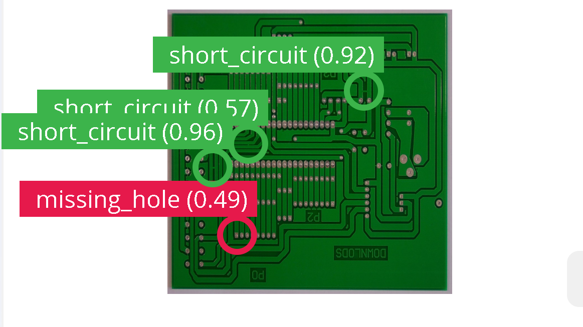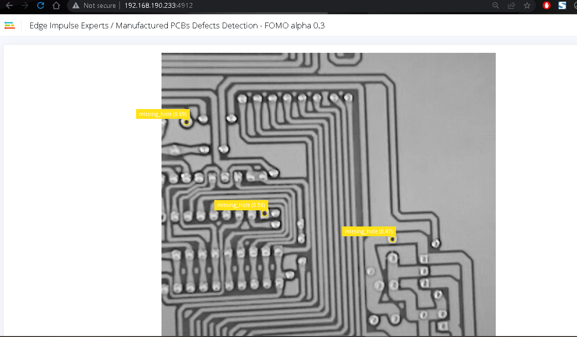 To reduce the number of defects on PCBs, a number of inspections are carried out at various points in the assembly line. With an increased number of PCB manufacturers and developers wanting a more compact and smaller circuit layout, companies have developed advanced inspection systems but still sometimes defects can go unnoticed. This project aims to look at three defects on a PCB and how machine learning can be used to identify them. One of the defects is missing holes which can be caused by faulty tooling or excessive processing. This hinders components or mountings to be put on the PCB. Next are the faulty defects: open and short circuits. These two can cause a device to be non-functional. An open circuit creates an infinitely high resistance therefore stopping current flow. A short circuit on the other hand creates a low resistance causing a high current to flow which can damage components or even cause a fire. While working on this project I built various models with MobileNetV2 SSD FPN-Lite 320x320, FOMO and YOLOv5 each with different parameters to achieve the best result. At the end, I settled on FOMO because it achieved a much better detection compared to the other models. Therefore to build our Machine Learning model, we will use FOMO and afterwards deploy the model to a Raspberry Pi 4B with the 8 megapixel V2.1 camera module.Quick Start