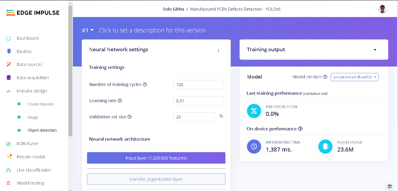 After training with FOMO and analyzing the results, I decided to train another model with YOLOv5 using the same dataset and classes. To train a YOLOv5 model on this custom dataset, I built a YOLOv5 model on my local computer using Edge Impulse custom learning blocks documentation and pushed it to my Edge Impulse account. This model was trained with various training cycles and learning rates. With 100 training cycles (epochs) and a learning rate of 0.01, The precision score of this model was not acceptable at 0.0%. FOMO has obviously performed much better compared to this model.