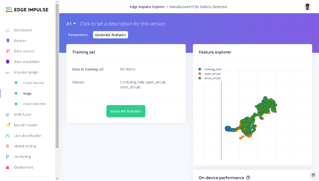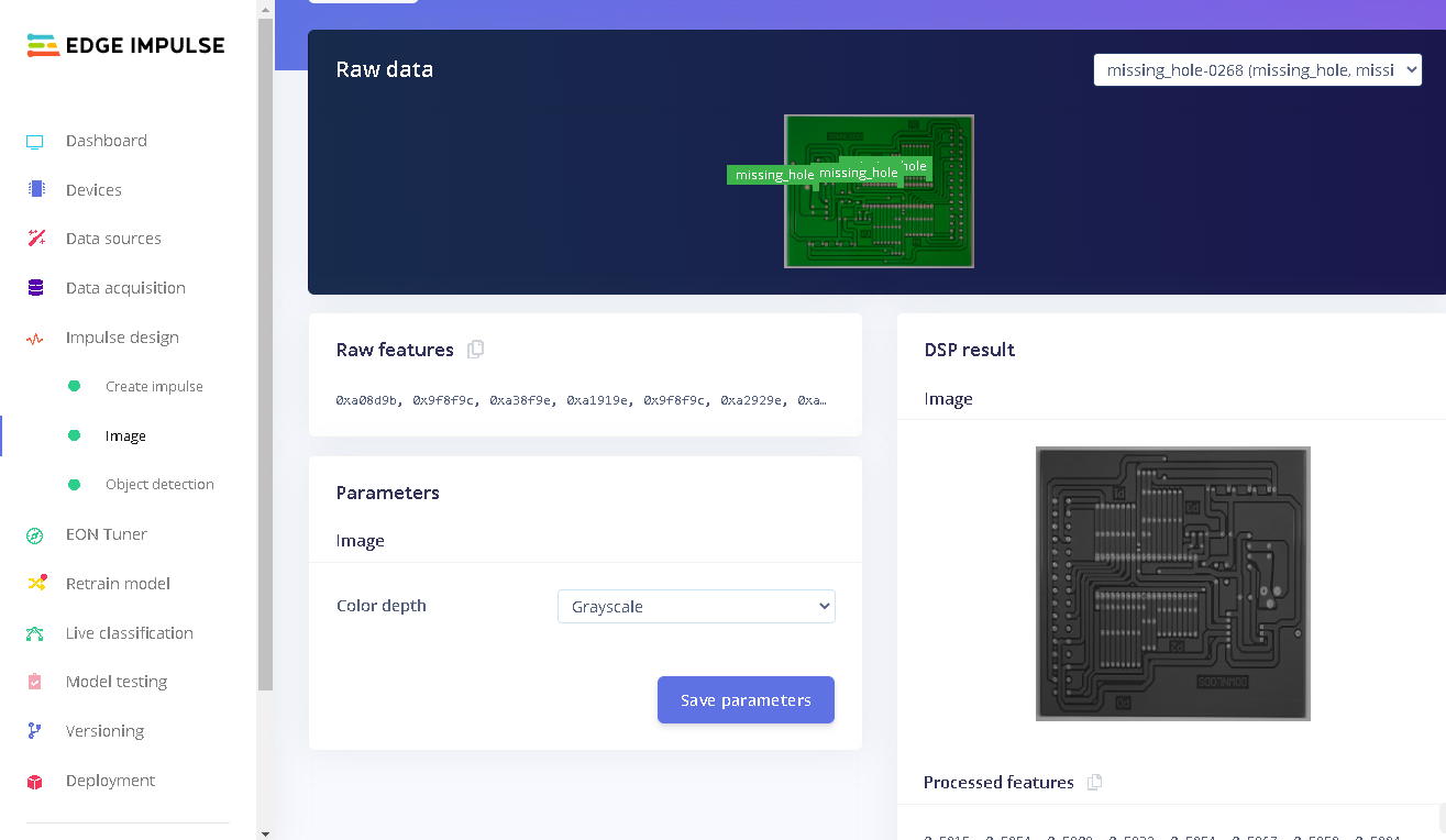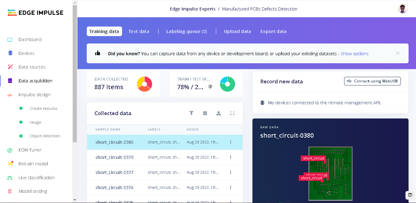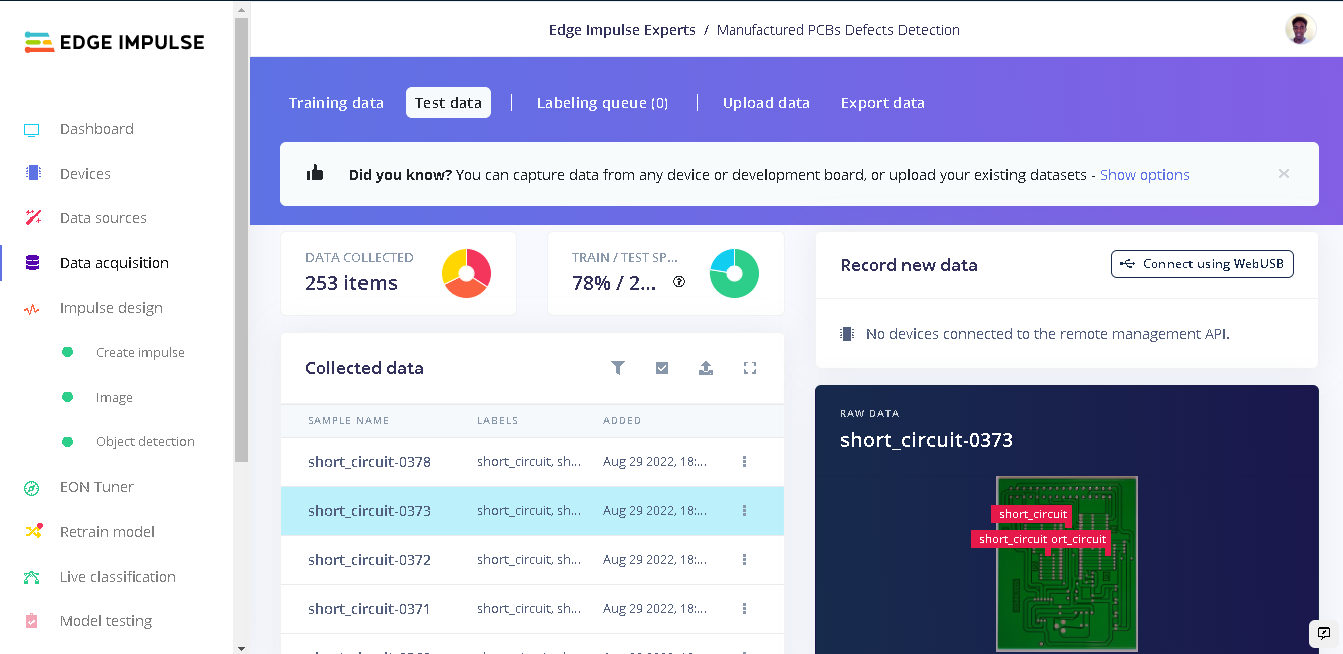 You can find the public project here: Manufactured PCBs Defects Detection. To add this project to your Edge Impulse projects, click “Clone” at the top of the window. Alternatively, to create a similar project, follow these steps after creating a new Edge Impulse project.Data Acquisition