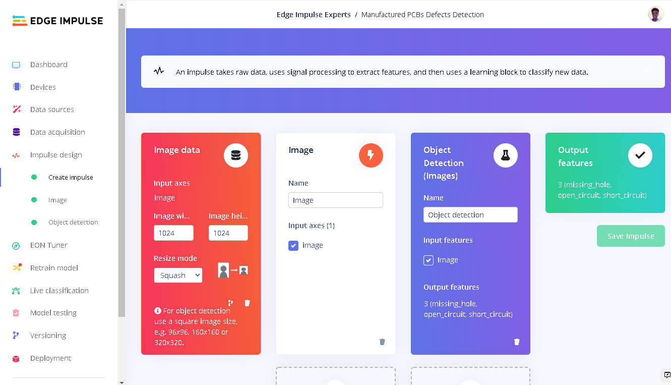 With our dataset in place we now need to configure important features: input, processing and learning blocks. This is a machine learning pipeline that indicates the type of input data, extracts features from the data, and finally a neural network that trains on the features from your data. Documentation on Impulse Design can be found here. We first click ”Create Impulse”. Here, set image width and height to 1024x1024 and Resize mode to Squash. Processing block is set to “Image” and the Learning block is “Object Detection (images)”. Click “Save Impulse” to use this configuration.