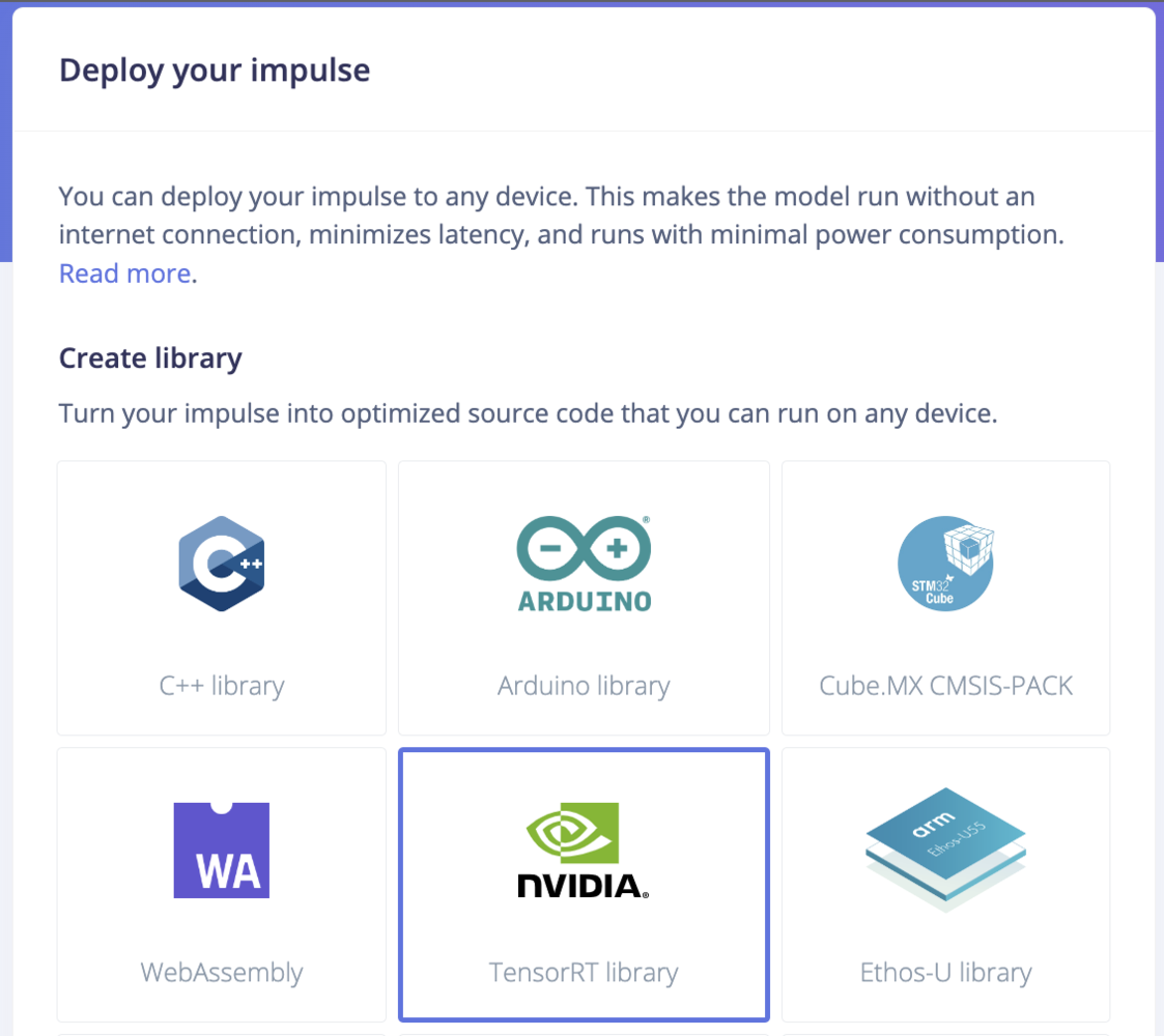 To achieve the highest possible inferencing rate we will be running the model using the GPU on the Jetson Xavier NX. On the Deployment page, we will choose NVIDIA TensorRT Library from the Deploy your impulse section.