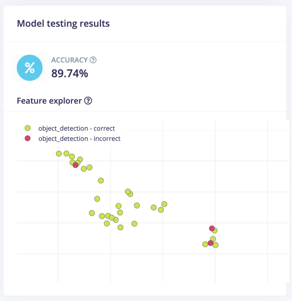 In the Model testing page, click on the Classify all button which will initiate testing with the trained float32 model. The testing accuracy is 89.74%.