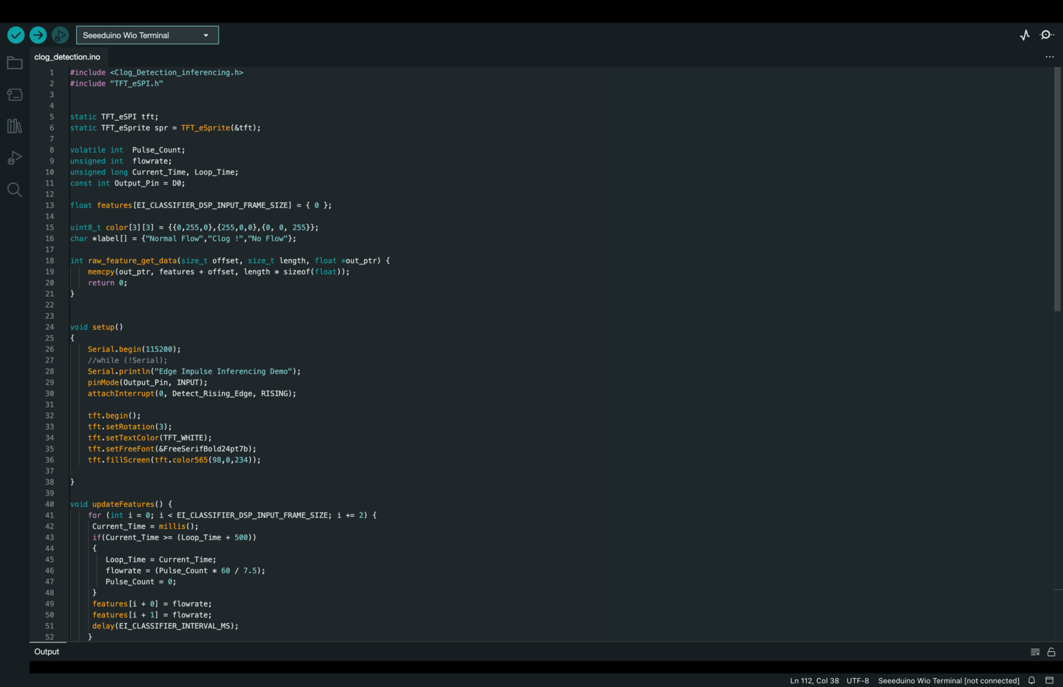 For our project, we are utilizing a water flow sensor that produces a pulse width modulation (PWM) signal as its output. Rather than collecting the analog values directly from the sensor, we have chosen to calculate the flow rate using an equation based on the PWM signal. This flow rate data is then collected as time series data, allowing us to track changes in flow rate over time. We have also collected flow rate data for three different scenarios: no flow, normal flow, and a clog. Through our analysis, we have determined that these three scenarios produce distinguishable patterns in the flow rate data that can be detected by our model. To collect data for your project, follow these steps:- Upload DataCollection.ino to Wio Terminal.