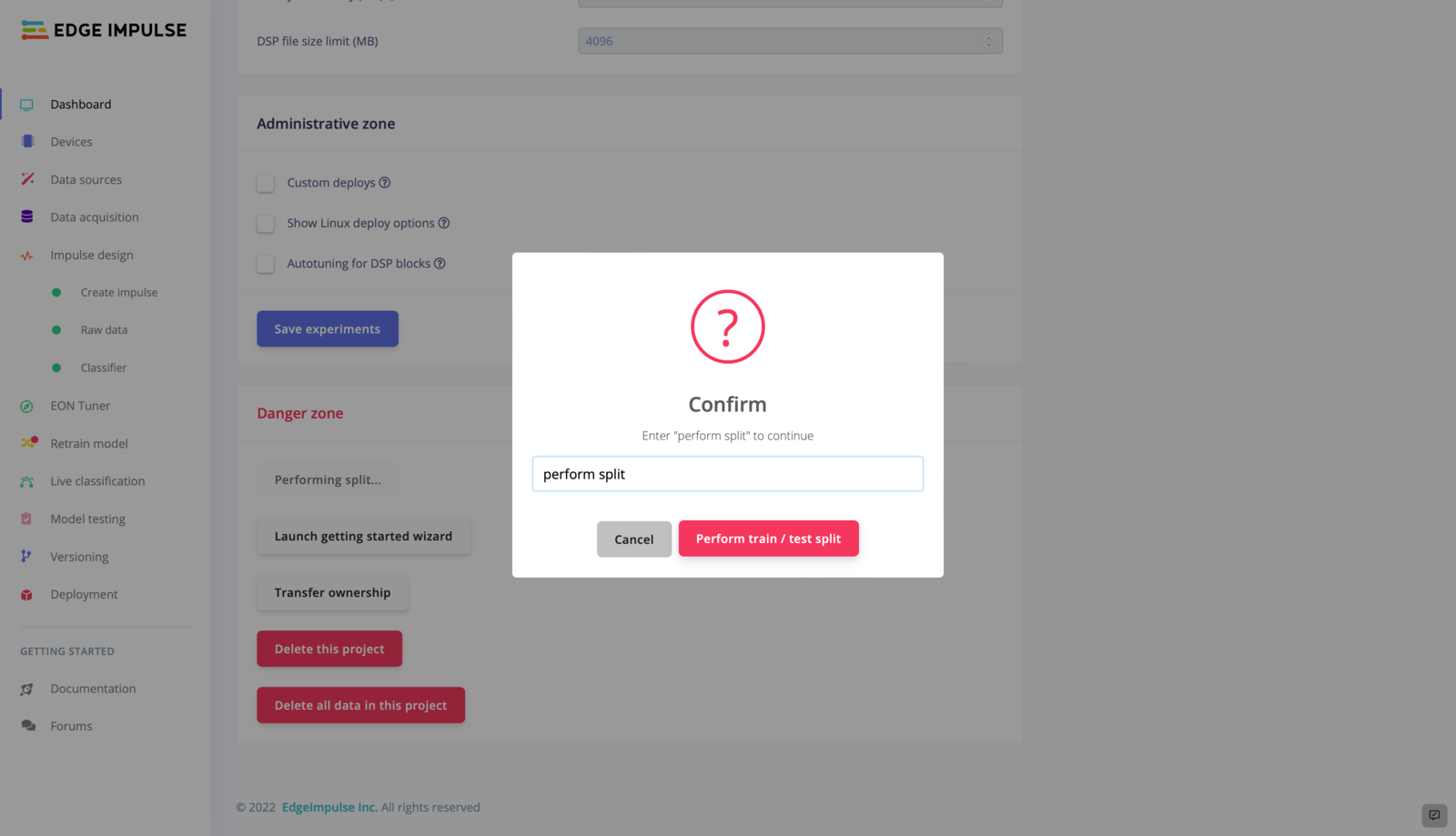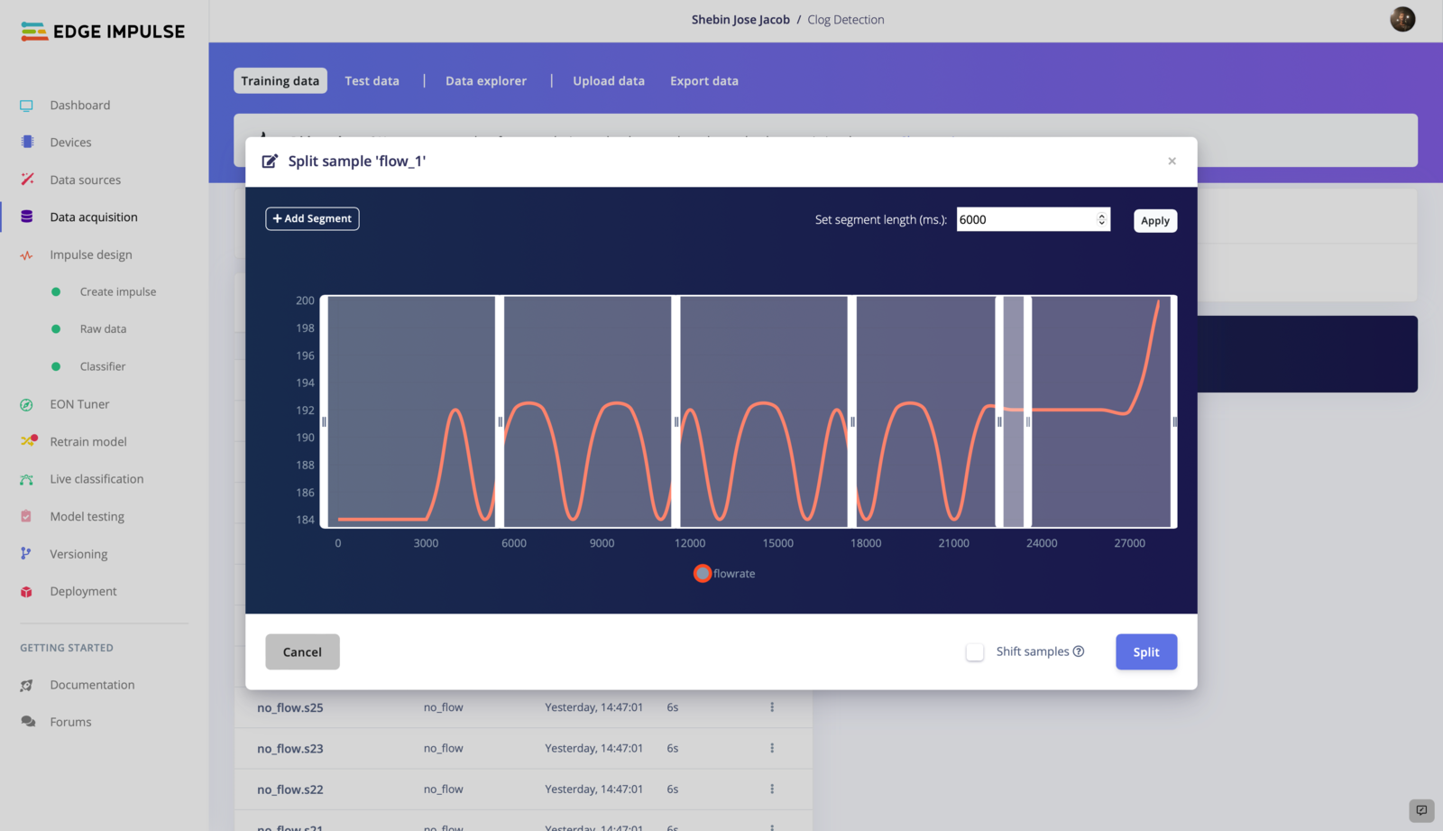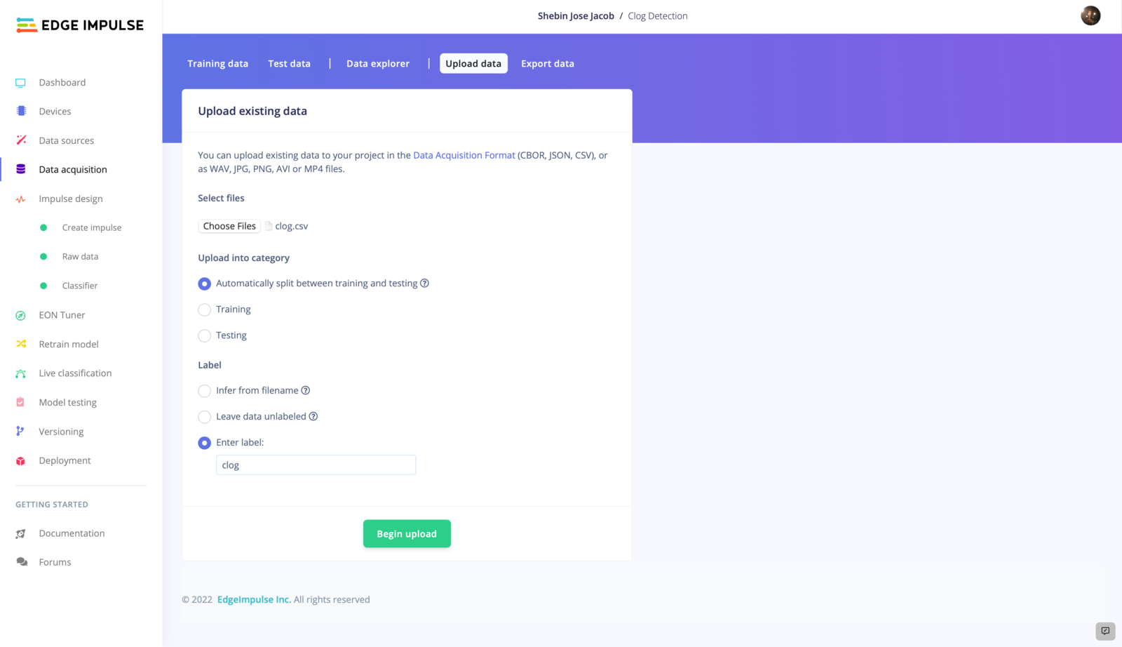 - Upload the CSV file to EdgeImpulse using the Data Acquisition Tab.