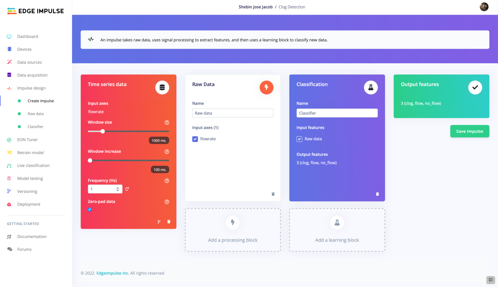 An impulse is a specialized machine learning pipeline designed to extract useful information from raw data and use it to make predictions or classify new data. The process of creating an impulse typically involves three main stages: signal processing, feature extraction, and learning. During the signal processing stage, the raw data is cleaned and organized in a format that is more suitable for analysis. This may involve removing noise or other extraneous information, and may also involve preprocessing the data in some way to make it more useful for the next stage of the process. Next, the feature extraction stage involves identifying and extracting important characteristics or patterns from the processed data. These features are the key pieces of information that the learning block will use to classify or predict new data. Finally, the learning block is responsible for categorizing or predicting new data based on the features extracted in the previous stage. This may involve training a machine learning model on the extracted features, or it may involve applying some other type of classification or prediction algorithm.