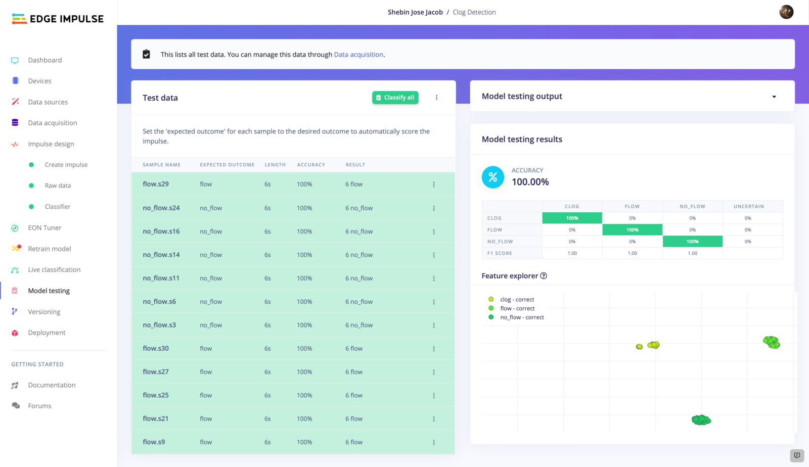 Having trained and fine-tuned our model to achieve a high level of accuracy, we are now ready to test its performance on some previously unseen data. To do this, we will navigate to the Model Testing tab and use the Classify All feature to evaluate the model’s performance. By applying the model to a new set of data, we can determine whether it is capable of accurately predicting flow rate patterns and classifying the data into one of three categories. If the model performs well on this test data, we can be confident that it will be able to provide useful and reliable insights when applied to real-world situations.