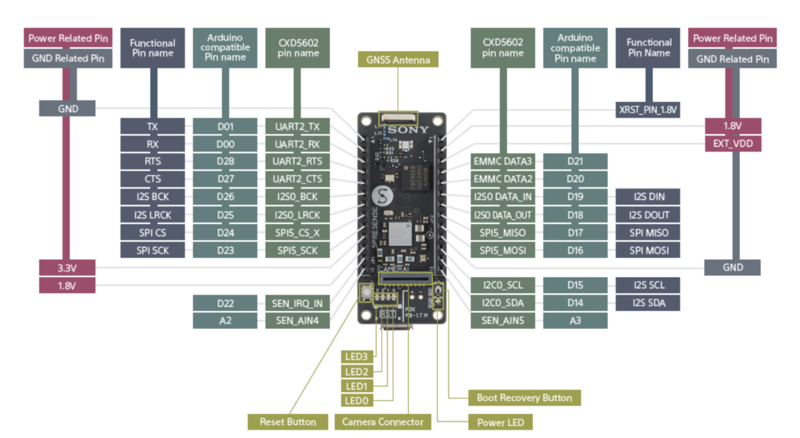 The Spresense main board has the following features: Sony’s CXD5602 Processor, 8 MB Flash memory, PCB with small footprint, Dedicated camera connector, GNSS (GPS) antenna, Pins and LEDs, Multiple GPIO (UART, SPI, I2C, I2S), 2 ADC channels, Application LED x 4 (Green), Power LED (Blue), USB serial port.
