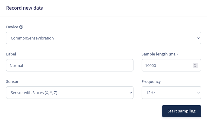 For vibration data, we must name the 3 axes exposed by the board as X, Y and Z. Then ,when recording data, make sure the 3-axes sensor is selected. Use a Sample length of 10 seconds and leave the frequency on the default value.