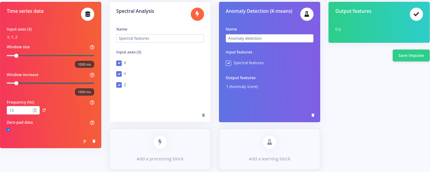 The Anomaly Detector block is a great way of detecting any anomalous behavior of the machinery during it’s runtime. Click on Select suggested axes to greatly increase the performance of this NN and to reduce its resource usage, as it will only take into account the features identified in the previous step.