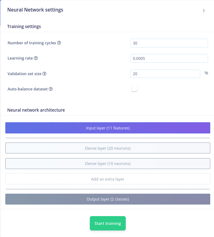 The next block in line is the NN Classifier block. Here you can control the number of training epochs, the rate at which the weights of the linkages between neurons are changed, and the percentage of training dataset samples that are used for validation. Additionally, if needed you can even change the structure of the neural network.