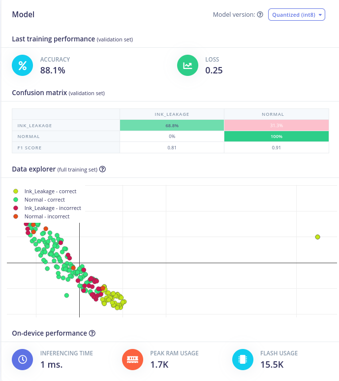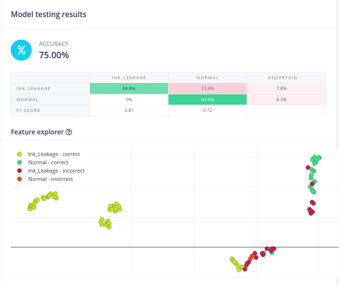 The user can see how the neural network performs when presented with data that it has never seen before using the Model Testing page. After clicking Classify all, Edge Impulse will then feed the neural network with all the data in the Testing data pool and display, just like during training the training process of the NN, the classification results and model performance.