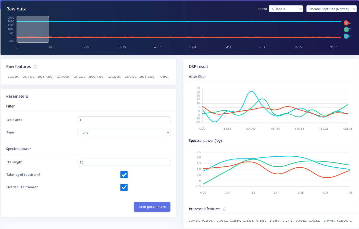 After populating the dataset it’s time to design the Impulse. The impulse allows the user to control the defining parameters parameters of the whole process of taking raw data from the dataset, pre-processing it into manageable chunks called “windows,” extracting the relevant features from them using digital signal processing algorithms, and then feeding them into a classification neural network that puts them in one of the defined classes.