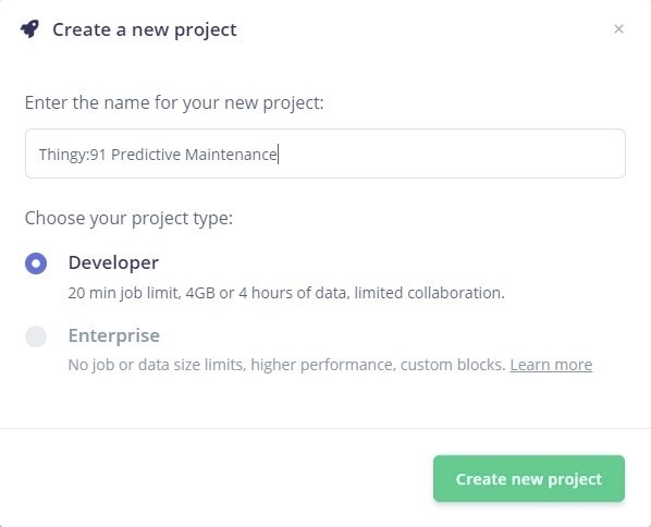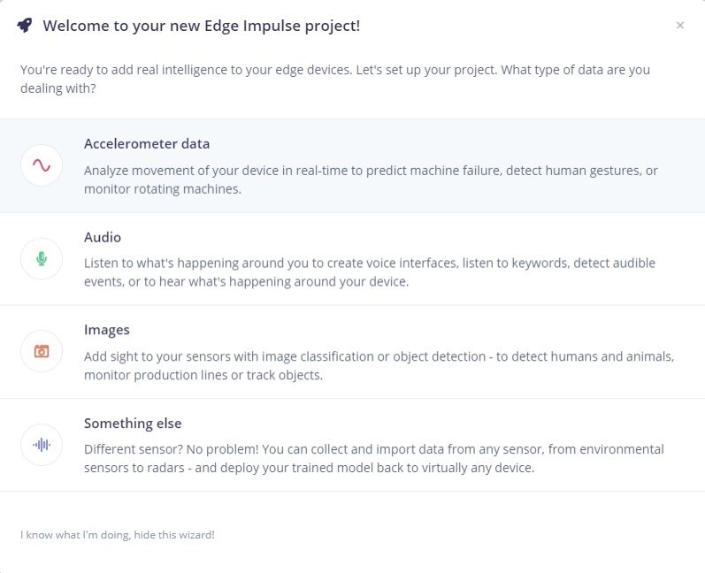 The first step towards building your TinyML Model is creating a new Edge Impulse Project. Once logged in to your Edge Impulse account, you will be greeted by the Project Creation screen.