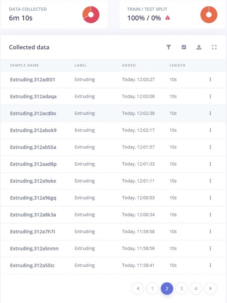 When monitoring an industrial system, purposefully running it in a faulty manner to collect data dedicated to training a model for failure detection is not possible since breaking would be out of the question. Instead, our approach is collecting data in a time where the machine operates nominally / is idling / is powered off and create an anomaly detection algorithm that will detect when something is out of order. With the device connected, head over to the Data acquisition tab. Before acquiring data we must set a Sample Length and a Reading Frequency. When sensors or other devices take measurements of some physical quantity, the process of converting this analogue signal into a digital representation is known as sampling. In order for the resulting digital signal to be an accurate representation of the original, it is important to respect the Nyquist–Shannon sampling theorem when carrying out this process. The Nyquist frequency is twice the highest frequency present in the signal being sampled, and Nyquist’s theorem states that if the sampling frequency is not equal to or higher than the Nyquist frequency, then aliasing will occur. This means that high-frequency components in the signal will be misrepresented in the digital version, leading to errors in the measurements.This being said, we will pick the highest frequency available, to avoid the aliasing phenomenon. When building the dataset, keep in mind that machine learning leverages data, so when creating a new class, try to record at least 3 minutes of data.