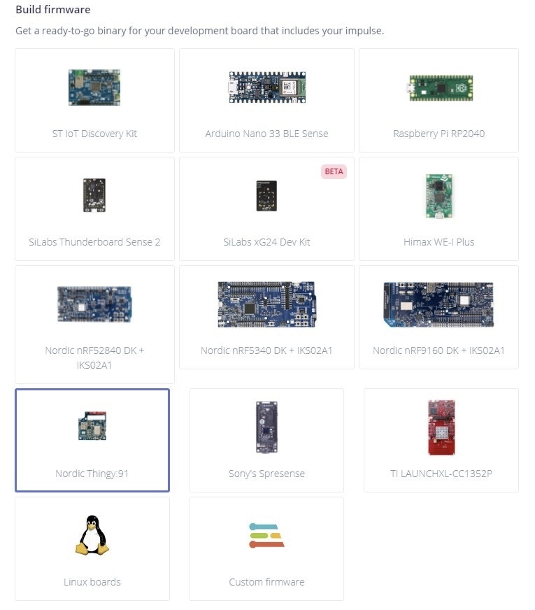 Deploying the newly created model on the Nordic Thingy:91 implies running it without an internet connection, optimizing the power consumption of the device and minimizing latency between measurements and analyzing them. Because the Thingy:91 board is fully supported by Edge Impulse, you can navigate to the Deployment tab, select the board and download a ready-to-go binary for it that includes the Impulse we have just built. Deploying the model in this manner is a great way of evaluating the on-board performance of the Impulse with the smallest time investment possible. It allows you to go back and tweak the model until it reaches the desired performance for your application.