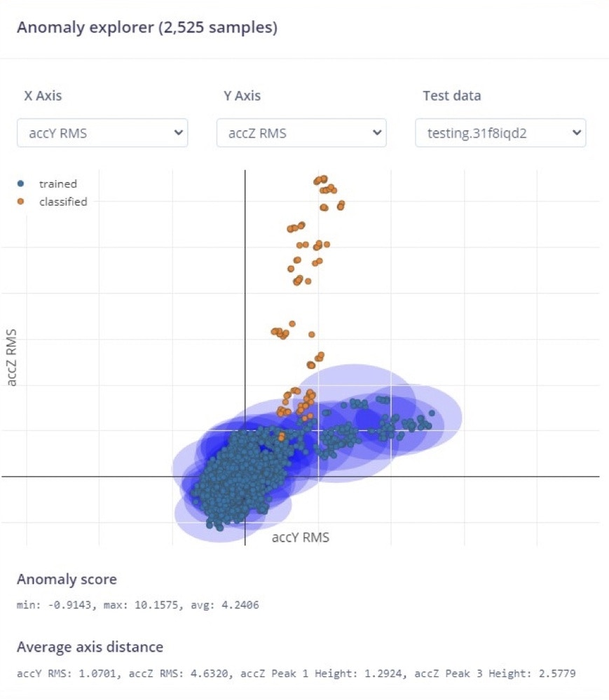 Even though we said earlier in this guide that purposefully running the machinery in a faulty manner is out of discussion, we have induced a small clog for 10 seconds in our machine to gather authentic data. To test out the model, head over to the Live Classification tab and press the Start Sampling button. Under the Summary tab you can see the number of samples that were placed in each category, and in the right side of the screen, you can see the Raw Data, Spectral Features and the Anomaly Explorer. Head over to the Anomaly detection under the Impulse Design menu and load your newly gathered sample in the Anomaly Explorer to analyze it even further.