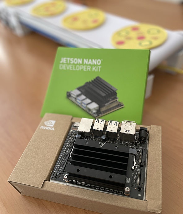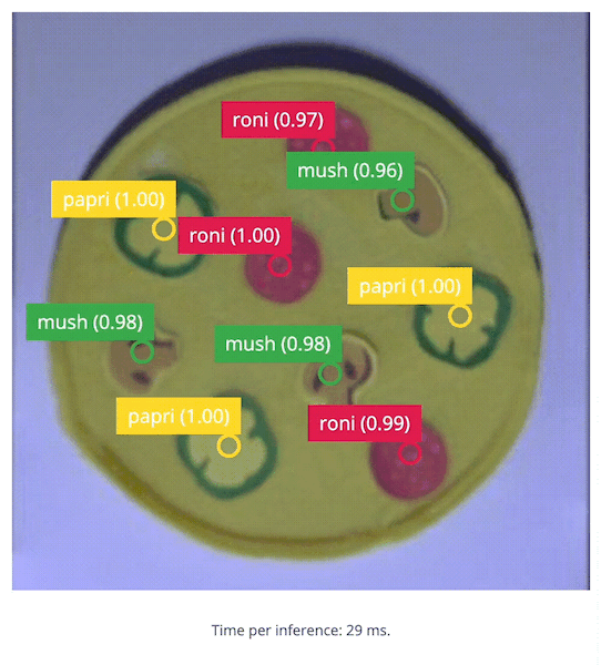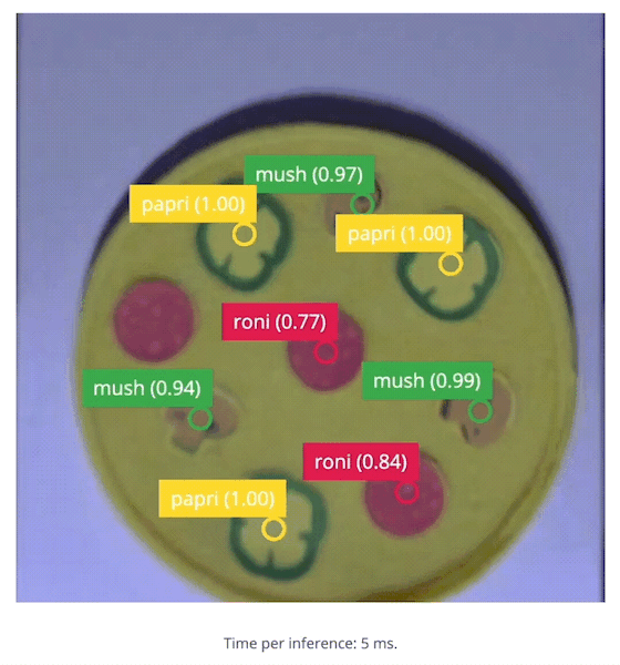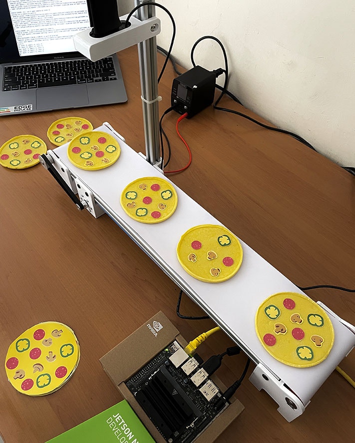 This project uses Edge Impulse’s FOMO (Faster Objects, More Objects) algorithm, which can quickly detect objects and use them as a quality/quantity check for products on a running conveyor belt. FOMO’s ability to know the number and position of coordinates of an object is the basis of this system. This project will explore the capability of the Nvidia Jetson Nano’s GPU to handle color video (RGB) with a higher resolution (320x320) than some other TinyML projects, while still maintaining a high inference speed. The machine learning model (model.eim) will be deployed with the TensorRT library, which will be compiled with optimizations for the GPU and will be setup via the Linux C++ SDK. Once the model can identify different pizza toppings, an additional Python program will be added, to check each pizza for a standard quantity of pepperoni, mushrooms, and paprikas. This project is a proof-of-concept that can be widely applied in the product manufacturing and food production industries to perform quality checks based on a quantity requirement of part in a product.