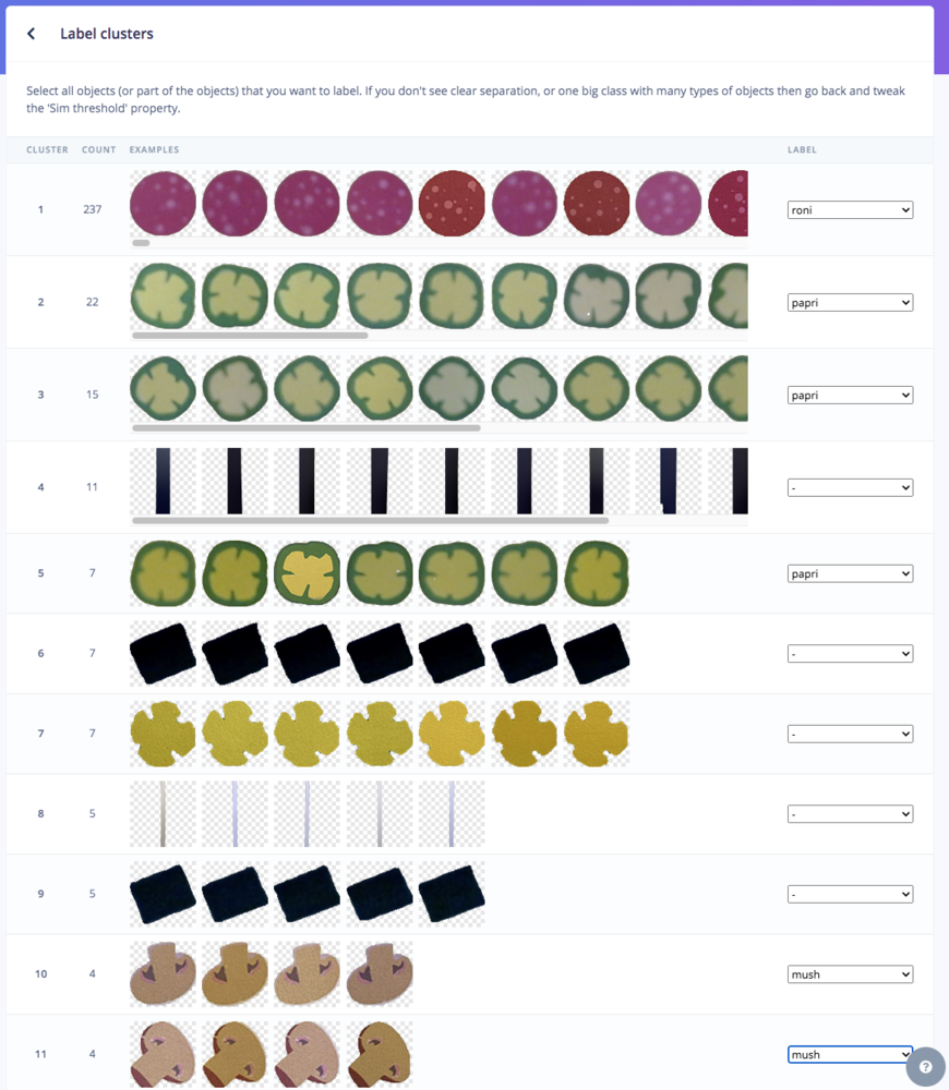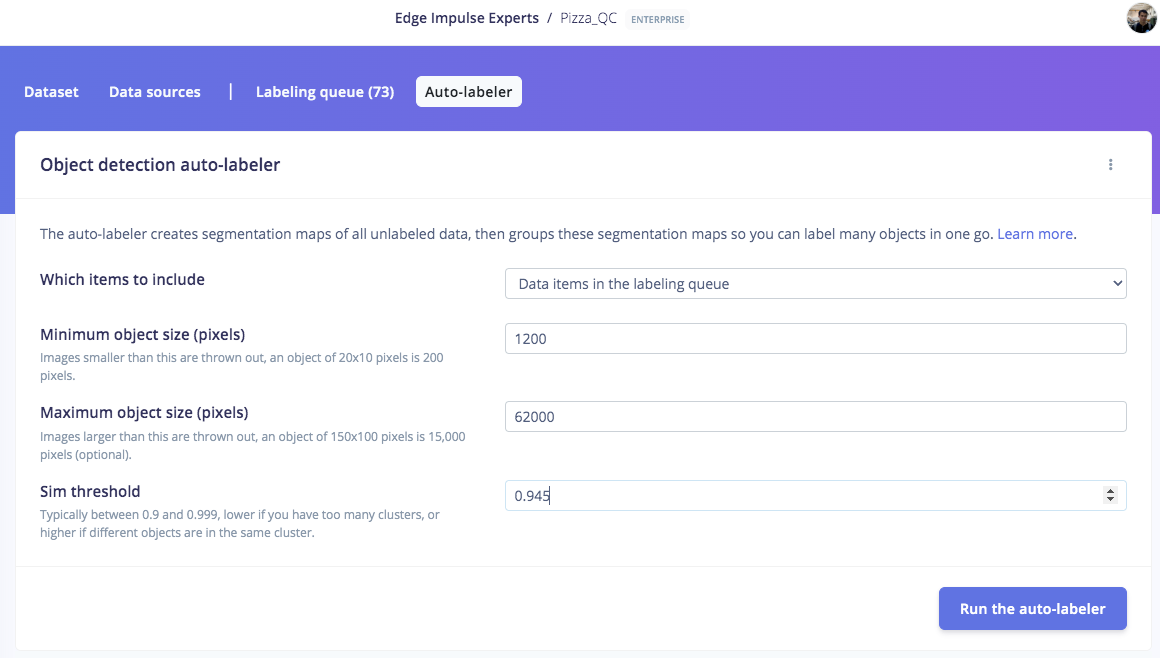 Go to http://studio.edgeimpulse.com, login or create an account, then create a new project. Choose the Images project option, then Classify Multiple Objects. In Dashboard > Project Info, choose Bounding Boxes for the labeling method and Nvidia Jetson Nano for the target device. Then in Data acquisition, click on the Upload Data tab, choose your photo files that you captured from your webcam or phone, choose Auto split, then click Begin upload. For Developer (free) accounts, next click on the Labelling queue tab, then start dragging a box around each object and label it, then save it. Repeat until all images are labelled. More information on this process, is located here: https://docs.edgeimpulse.com/docs/edge-impulse-studio/data-acquisition/labeling-queue For Enterprise (paid) accounts, you will instead click on Auto-Labeler in Data Acquisition. This auto-labeling segmentation / cluster process will save a lot of time over the manual process above. Set the min/max object pixels and sim threshold (0.9 - 0.999) to adjust the sensitivity of cluster detection, then click Run. Next, you can label each cluster result as desired. If something doesn’t match or if there is additional data, labeling can be done manually as well.