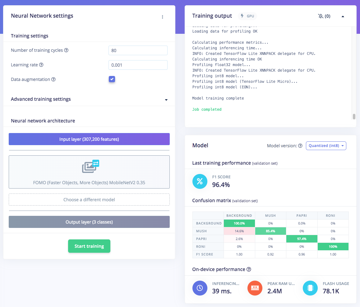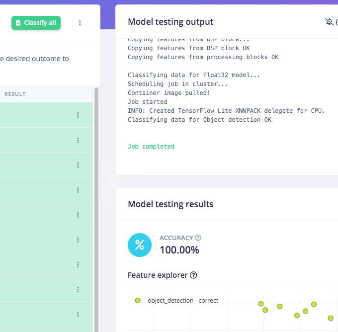 Once you have the dataset ready, go to Create Impulse and in the Image block, set 320 x 320 as the image width and height. Then choose Fit shortest axis, and choose Image and Object Detection as Learning and Processing blocks. In the Image parameters section, set the color depth as RGB then press Save parameters. Then click on Generate and navigate to the Object Detection block setup using the left navigation. Leave the training setting for Neural Network as it is or check our settings — in our case everything is quite balanced, so we’ll leave them alone and choose FOMO (MobileNet V2 0.35). Train the model by pressing the Start training button. You can see the progress of the training in the log to the right. If everything is OK, the training will job will finish in a short while, then we can test the model. Go to the Model Testing section and click Classify all. Our result is above 90%, so we can move on to the next step — Deployment.