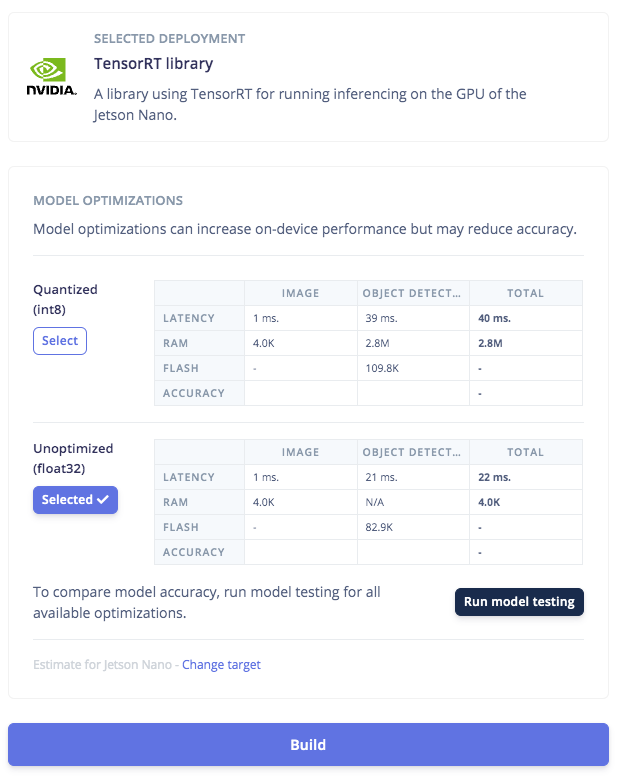 Click on the Deployment tab then search for TensorRT, then select Float32 and click Build. This will build an Nvidia TensorRT library for running inference, targeting the Jetson Nano’s GPU. Once the build finishes and the file is downloaded, open the.zip file, then we’re ready for model deployment with the Edge Impulse C++ SDK on the Jetson Nano side.