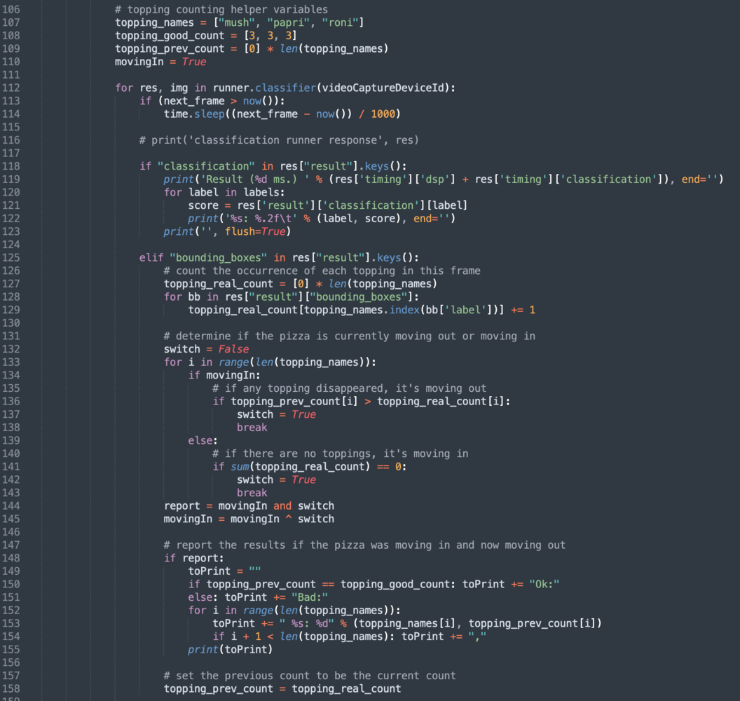 With the impressive performance of live inferencing shown by the Linux Runner, now we will create a Python program to be able to calculate the number of toppings on a pizza compared to a desired amount, and that will provide an OK or Bad output if the number of toppings is incorrect. Because we’ll use Python, we need to install the Edge Impulse Python SDK and clone the repository with the Edge Impulse provided examples. Follow the steps here) to install the Python SDK. Once the SDK is installed, be sure togit clone https://github.com/edgeimpulse/linux-sdk-python as well, so that you have the samples locally.